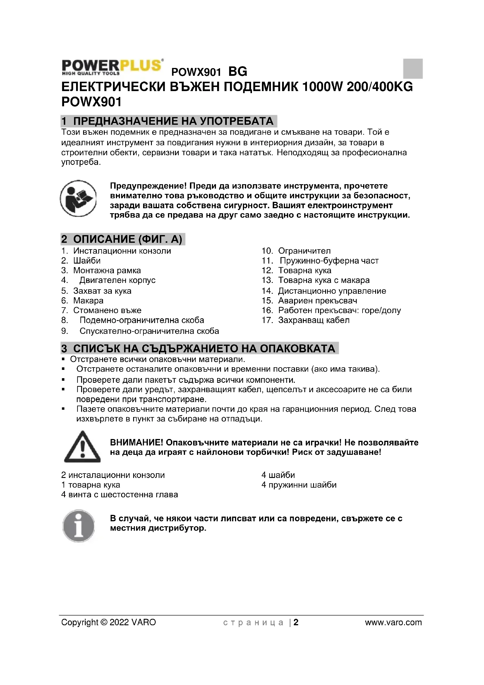 - Пазете опаковъчните материали почти до края на гаранционния период. След това изхвърлете в пункт за събиране на отпадъци. ВНИМАНИЕ! Опаковъчните материали не са играчки! Не позволявайте на деца да играят с найлонови торбички! Риск от задушаване! 2 инсталационни конзоли 1 товарна кука 4 винта с шестостенна глава 4 шайби 4 пружинни шайби В случай, че някои части липсват или са повредени, свържете се с местния дистрибутор.POWX901 BG Copyright © 2022 VARO с т р а н и ц а | 3 www.varo.com 4 СИМВОЛИ В настоящия наръчник и/или върху машината са използвани следните символи: