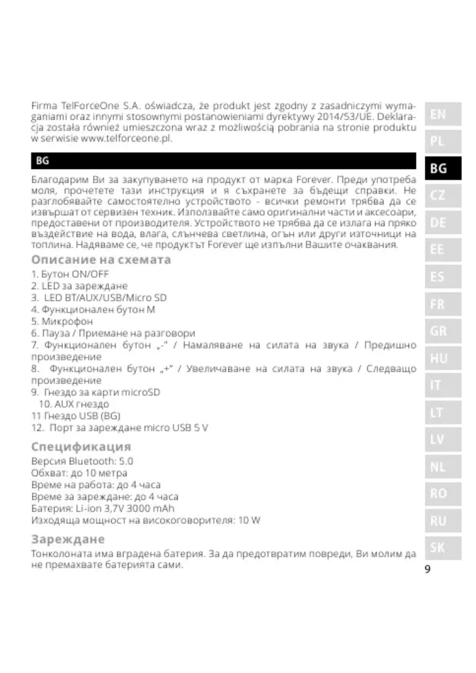 високоговорителя „BS-660” и сдвоете устройствата. Двойно натискане на бутон Play ще изключи функция TWS. Фирма TelForceOne S.A. декларира, че продуктът изпълнява основните изисквания и останалите приложими разпоредби на директива 2014/53/UE. Декларацията е публикувана с възможност за изтегляне на уеб страницата на продукта в сайта www.telforceone.pl.