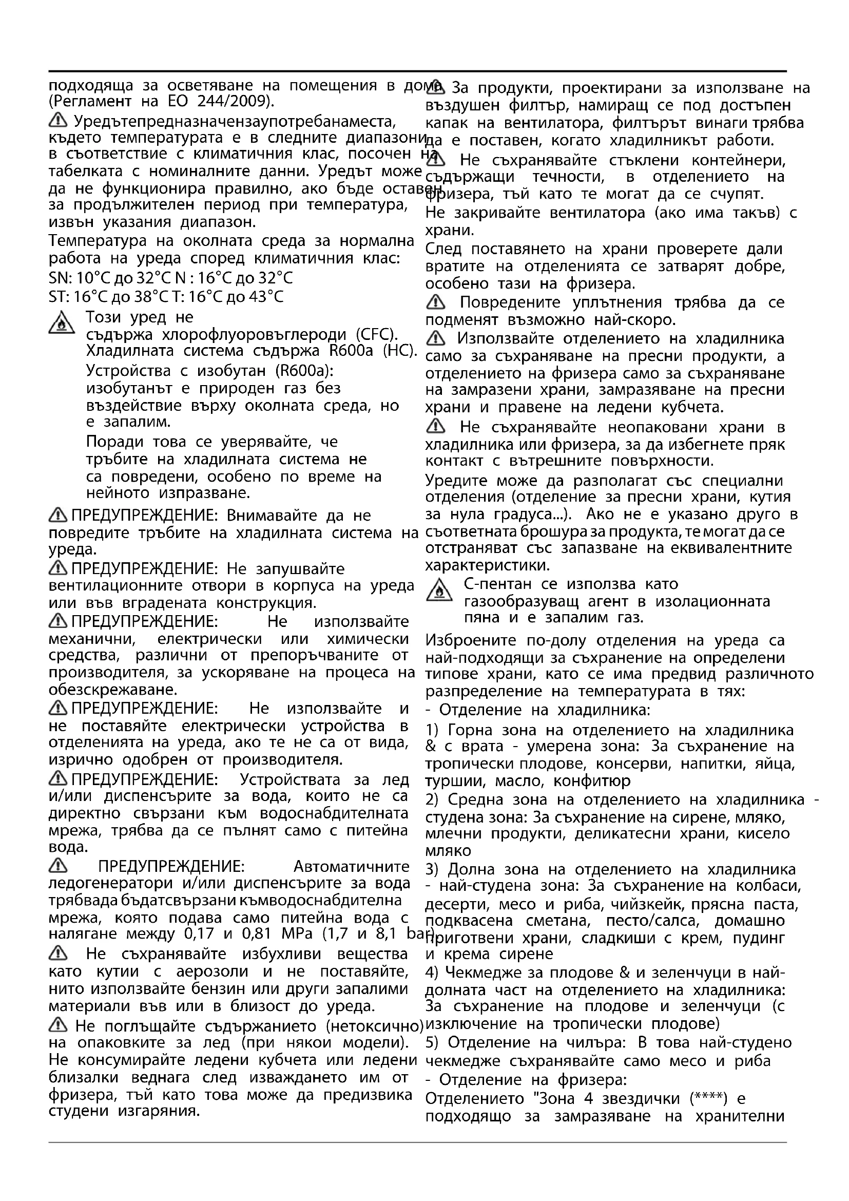 ПРЕДУПРЕЖДЕНИЕ: Не запушвайте вентилационните отвори в корпуса на уреда или във вградената конструкция. ПРЕДУПРЕЖДЕНИЕ: Не използвайте механични, електрически или химически средства, различни от препоръчваните от производителя, за ускоряване на процеса на обезскрежаване. ПРЕДУПРЕЖДЕНИЕ: Не използвайте и не поставяйте електрически устройства в отделенията на уреда, ако те не са от вида, изрично одобрен от производителя. ПРЕДУПРЕЖДЕНИЕ: Устройствата за лед и/или диспенсърите за вода, които не са директно свързани към водоснабдителната мрежа, трябва да се пълнят само с питейна
