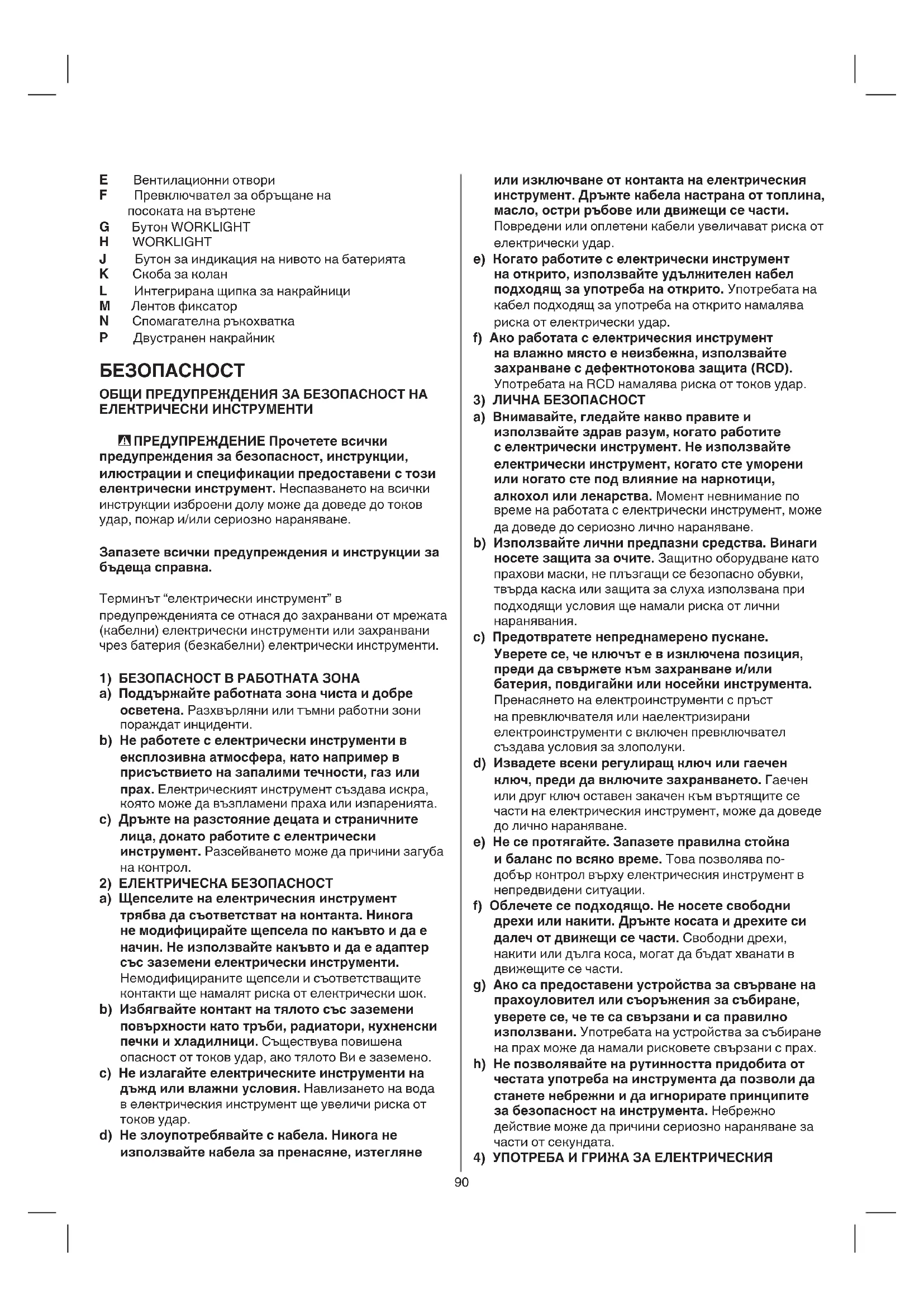 E Вентилационни отвоpи F Пpевключвател за обpъщане на посоката на въpтене G Бутон WORKLIGHT H WORKLIGHT