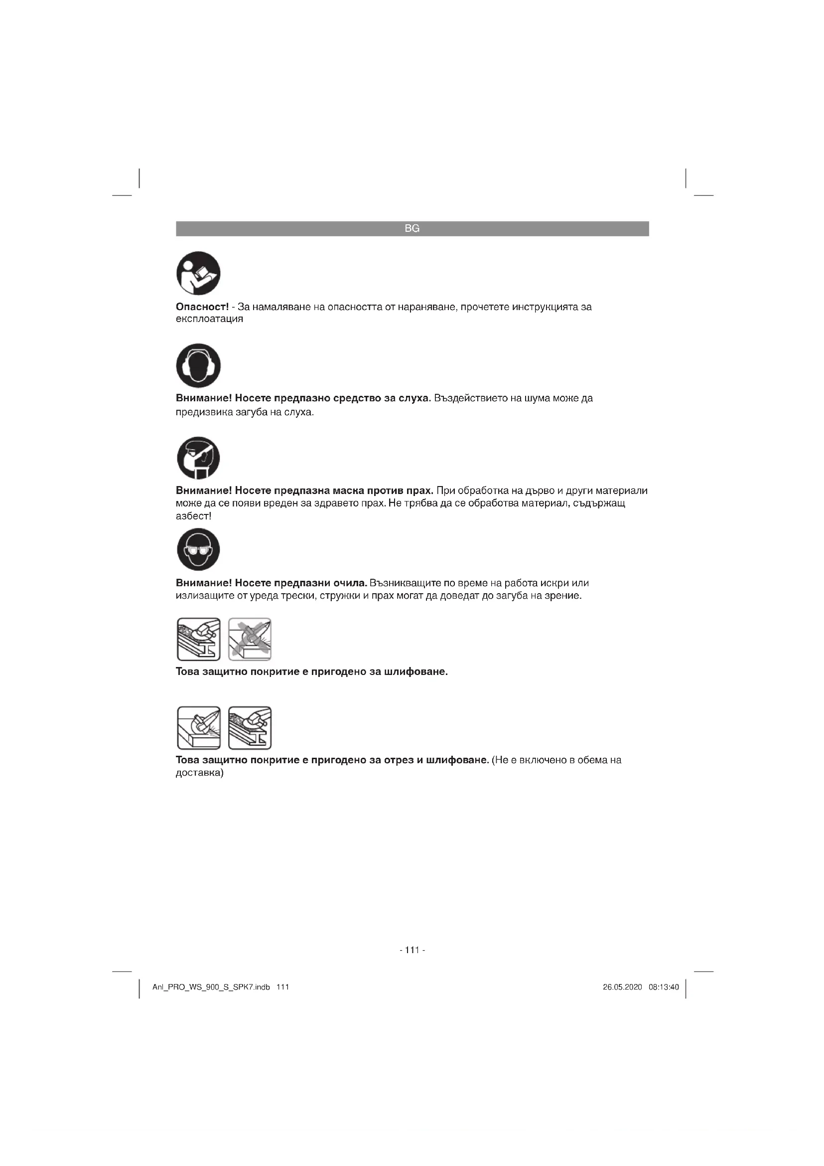 Ъглошлайфът е предназначен за шлифоване на метал и камък като се използва съответният шлифовъчен диск и съответното защитно приспособление. Предупреждение! Ъглошлайфът може да се използва за отрез на метал и камък, само ако е монтирано защитното приспособление, което може да се получи като принадлежност. Машината трябва да се използва само по предназначението й. Всяка по-нататъшна извън това употреба не е по предназначение. За предизвикани от това щети или наранявания от всякакъв вид отговорност носи потребителят/обслужващото лице, а не производителят. Anl_PRO_WS_900_S_SPK7.indb 112Anl_PRO_WS_900_S_SPK7.indb 112 26.05.2020 08:13:4126.05.2020 08:13:41BG