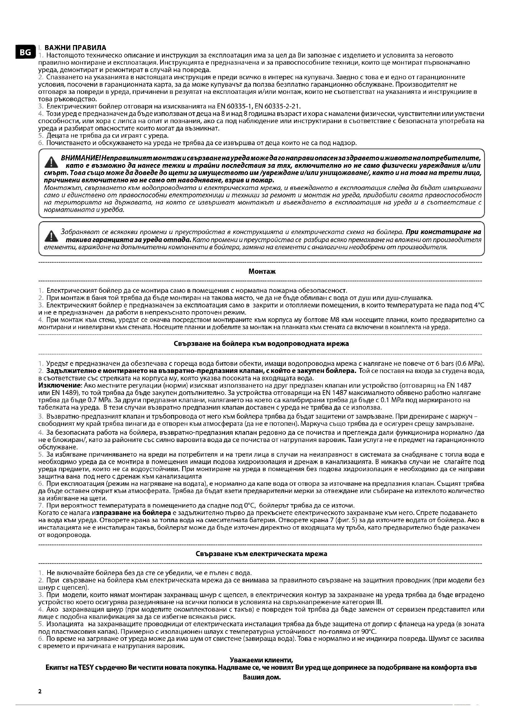 2. При свързване на бойлера към електрическата мрежа да се внимава за правилното свързване на защитния проводник (при модели без шнур с щепсел). 3. При модели, които нямат монтиран захранващ шнур с щепсел, в електрическия контур за захранване на уреда трябва да бъде вградено устройство което осигурява разединяване на всички полюси в условията на свръхнапрежение категория III. 4. Ако захранващия шнур (при моделите окомплектовани с такъв) е повреден той трябва да бъде заменен от сервизен представител или лице с подобна квалификация за да се избегне всякакъв риск. 5. Изолацията на захранващите проводници от електрическата инсталация трябва да бъдe защитенa от допир с фланеца на уреда (в зоната под пластмасовия капак). Примерно с изолационен шлаух с температурна устойчивост по-голяма от 90°C. 6. По време на загряване от уреда може да има шум от свистене (завираща вода). Това е нормално и не индикира повреда. Шумът се засилва с времето и причината е натрупания варовик. Уважаеми клиенти, Екипът на TESY сърдечно Ви честити новата покупка. Надяваме се, че новият Ви уред ще допринесе за подобряване на комфорта във Вашия дом.3Български