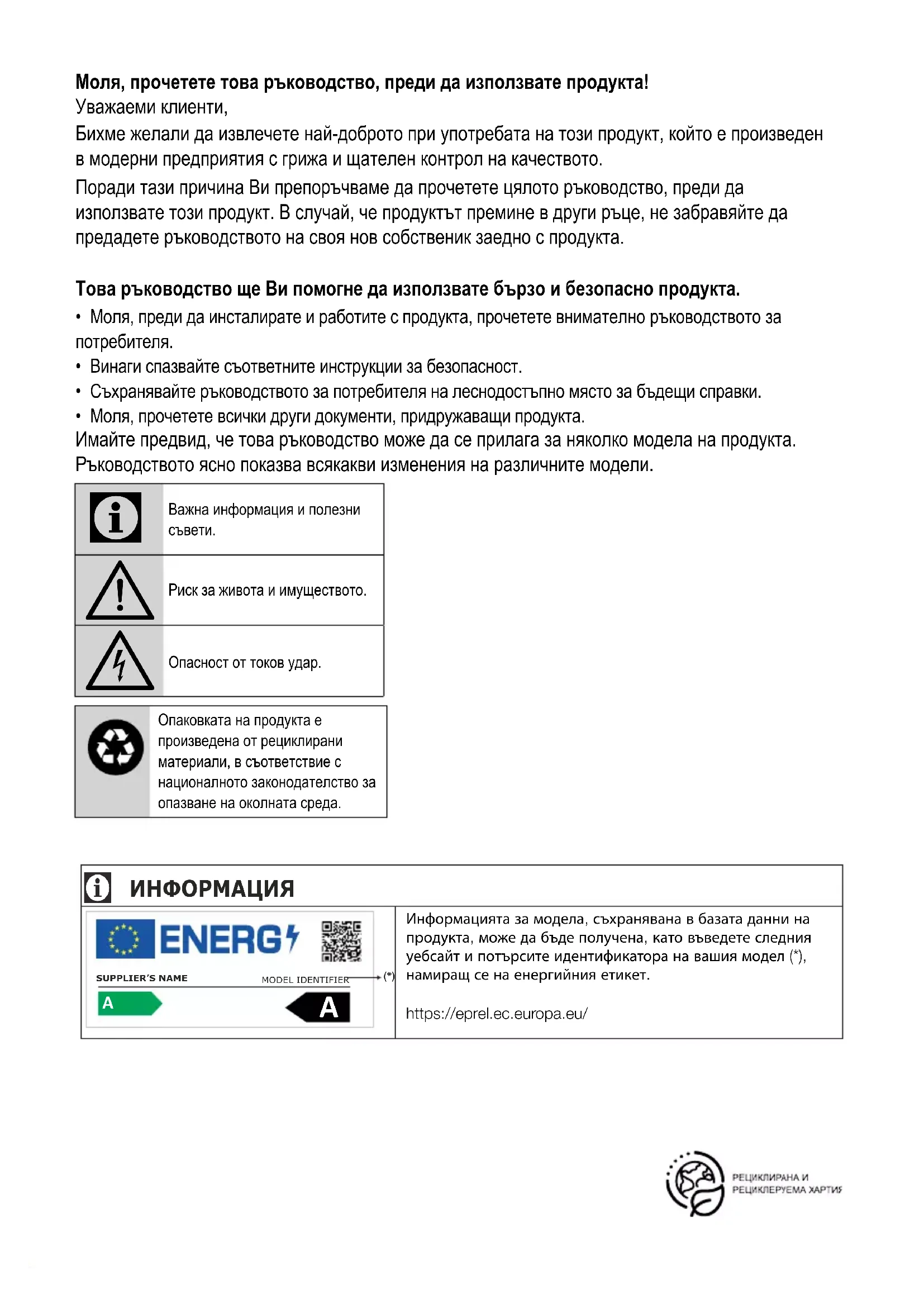 Важна информация и полезни съвети. Риск за живота и имуществото. Опасност от токов удар.Опаковката на продукта е произведена от рециклирани материали, в съответствие с националното законодателство за опазване на околната среда.