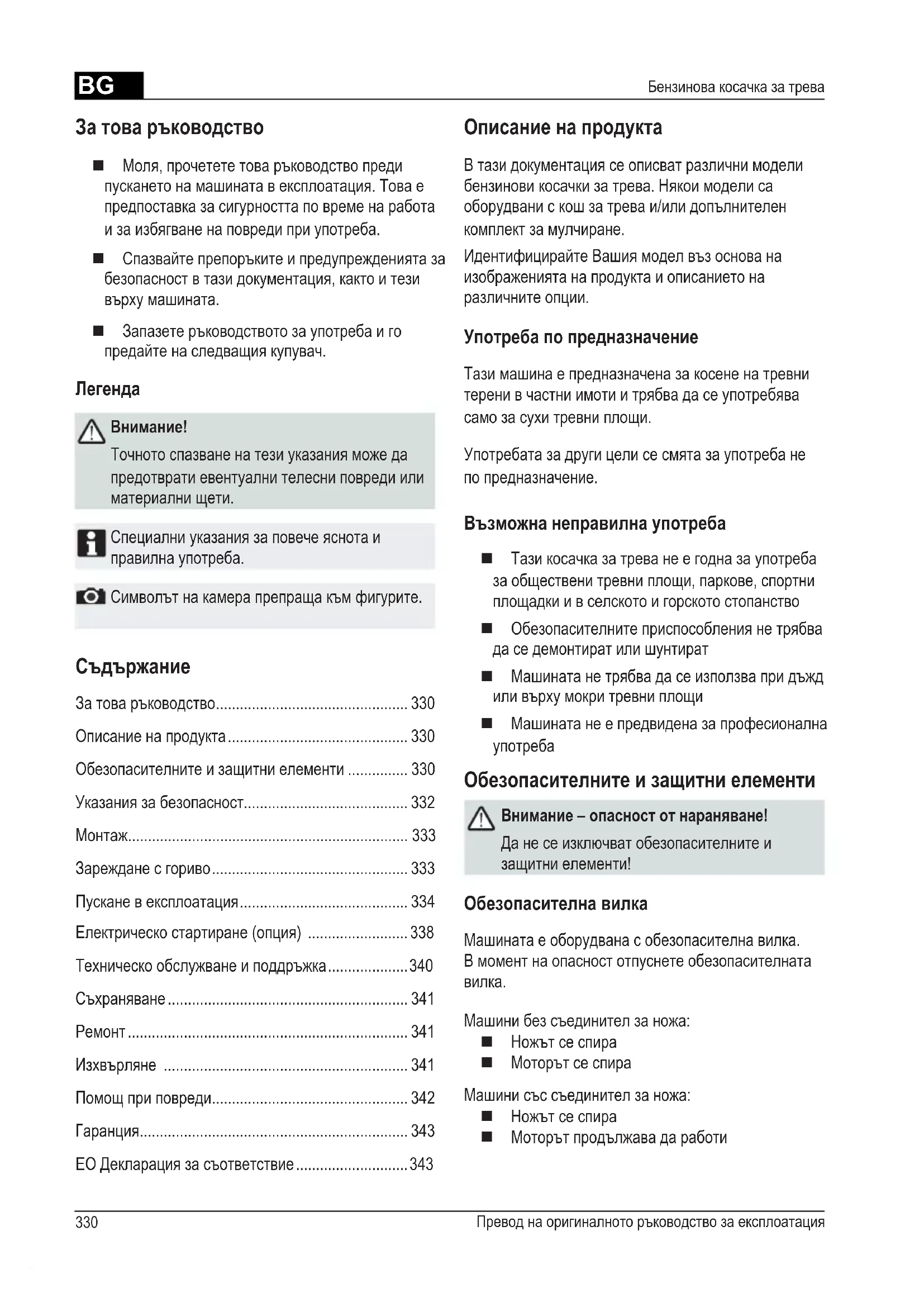 Точнотоспазваненатезиуказанияможеда предотвратиевентуалнителесниповредиили материалнищети. Специалниуказаниязаповечеяснотаи правилнаупотреба. Символътнакамерапрепращакъмфигурите. Описание на продукта Втазидокументациясеописватразличнимодели бензиновикосачкизатрева.Някоимоделиса оборудванискошзатреваи/илидопълнителен комплектзамулчиране. ИдентифицирайтеВашиямоделвъзоснована изображениятанапродуктаиописаниетона различнитеопции. Употреба по предназначение Тазимашинаепредназначеназакосененатревни теренивчастниимотиитрябвадасеупотребява самозасухитревниплощи. Употребатазадругицелисесмятазаупотребане попредназначение. Възможна неправилна употреба Тазикосачказатреванеегодназаупотреба заобщественитревниплощи,паркове,спортни площадкиивселскотоигорскотостопанство Обезопасителнитеприспособлениянетрябва даседемонтиратилишунтират Машинатанетрябвадасеизползвапридъжд иливърхумокритревниплощи Машинатанеепредвиденазапрофесионална
