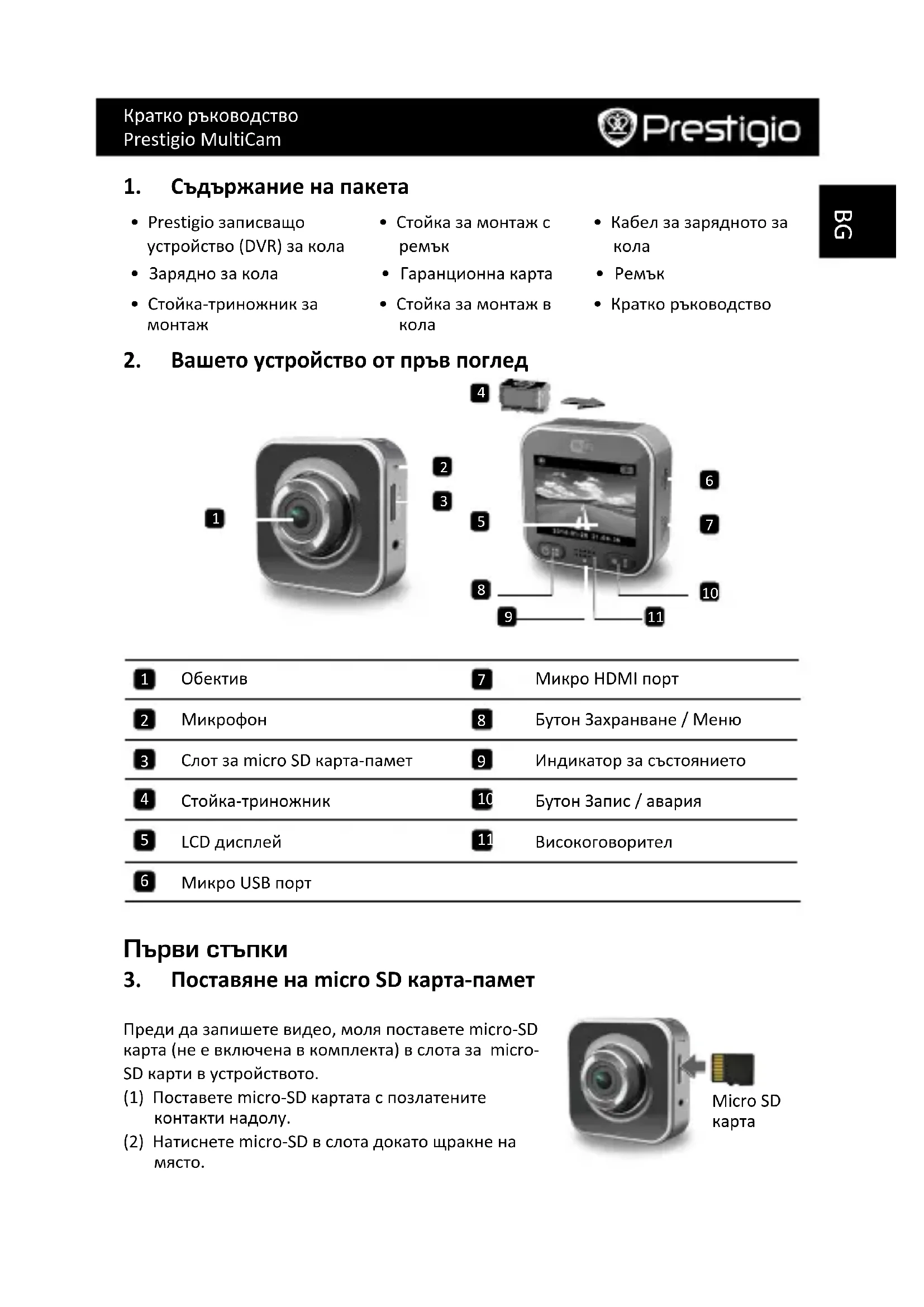Преди да запишете видео, моля поставете micro-SD карта (не е включена в комплекта) в слота за micro- SD карти в устройството. (1) Поставете micro-SD картата с позлатените контакти надолу. (2) Натиснете micro-SD в слота докато щракне на място.Кратко ръководство Prestigio MultiCam