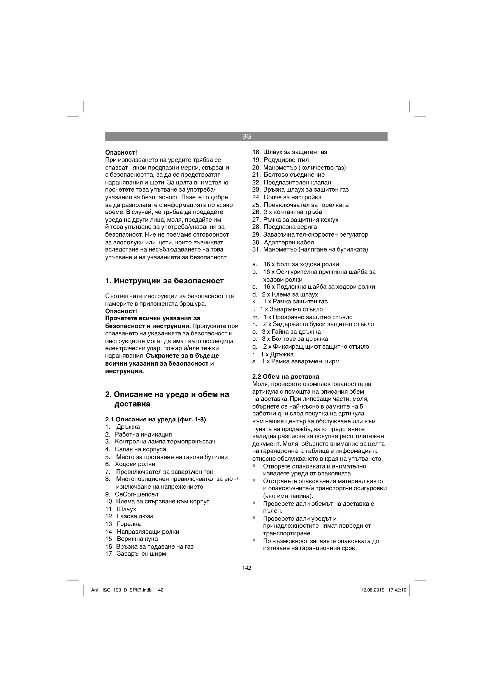 към мрежа (виж точка 5.3), поставете превключвател Вкл./Изкл.ток за заварки (фиг.1/7; 8) на степен 1; 230 V/400 V и задействайте превключвателя на горелката (фиг. 5/25), за да освободите притока на газ. Сега настройте искания дебит върху редукционния вентил (фиг. 4/19). Anl_HSG_190_D_SPK7.indb 147Anl_HSG_190_D_SPK7.indb 147 12.08.2015 17:42:1112.08.2015 17:42:11BG