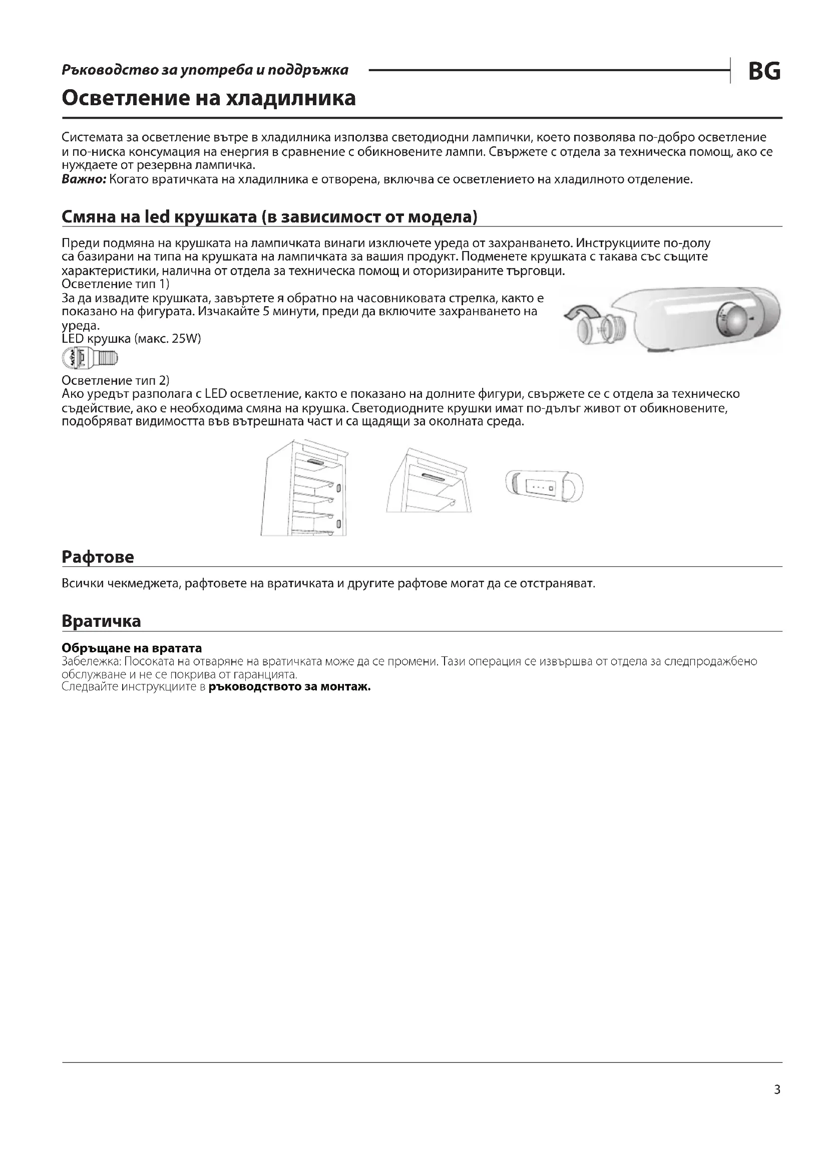 Ръководство за употреба и поддръжка Осветление на хладилника Системата за осветление вътре в хладилника използва светодиодни лампички, което позволява по-добро осветление и по-ниска консумация на енергия в сравнение с обикновените лампи. Свържете с отдела за техническа помощ, ако се нуждаете от резервна лампичка. Важно: Когато вратичката на хладилника е отворена, включва се осветлението на хладилното отделение. Смяна на led крушката (в зависимост от модела) Преди подмяна на крушката на лампичката винаги изключете уреда от захранването. Инструкциите по-долу са базирани на типа на крушката на лампичката за вашия продукт. Подменете крушката с такава със същите характеристики, налична от отдела за техническа помощ и оторизираните търговци. Осветление тип 1) За да извадите крушката, завъртете я обратно на часовниковата стрелка, както е показано на фигурата. Изчакайте 5 минути, преди да включите захранването на