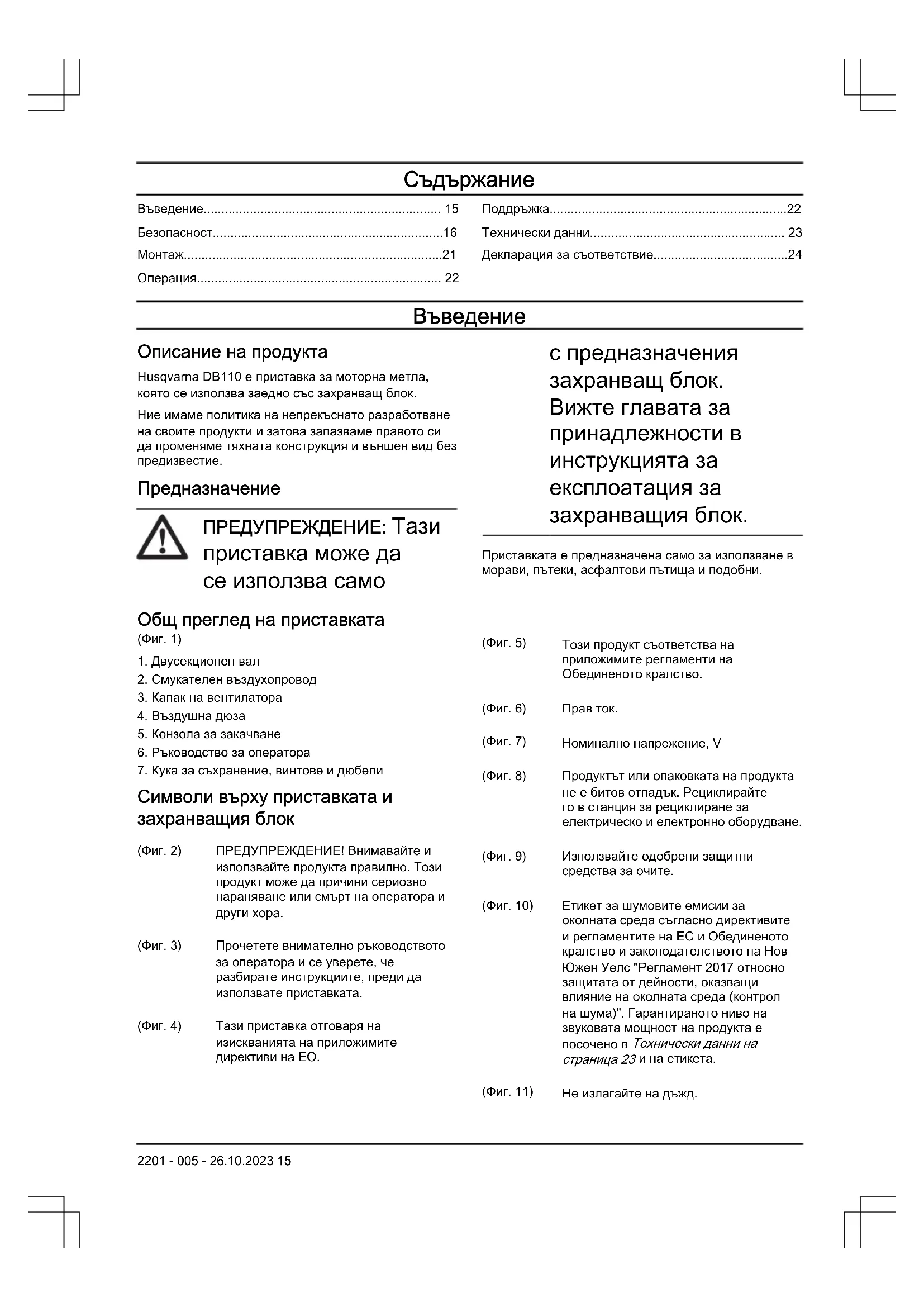 Технически данни на страница 23 и на етикета. (Фиг. 11) Не излагайте на дъжд. 2201 - 005 - 26.10.2023 15(Фиг. 12) Разкачете акумулаторната батерия преди техническо обслужване. (Фиг. 13) ПРЕДУПРЕЖДЕНИЕ – пазете се от изхвърлени предмети. (Фиг. 14) ПРЕДУПРЕЖДЕНИЕ – дръжте страничните лица далеч. Забележка: Останалите символи/стикери върху приставката се отнасят за специфични изисквания по отношение на сертификати за определени