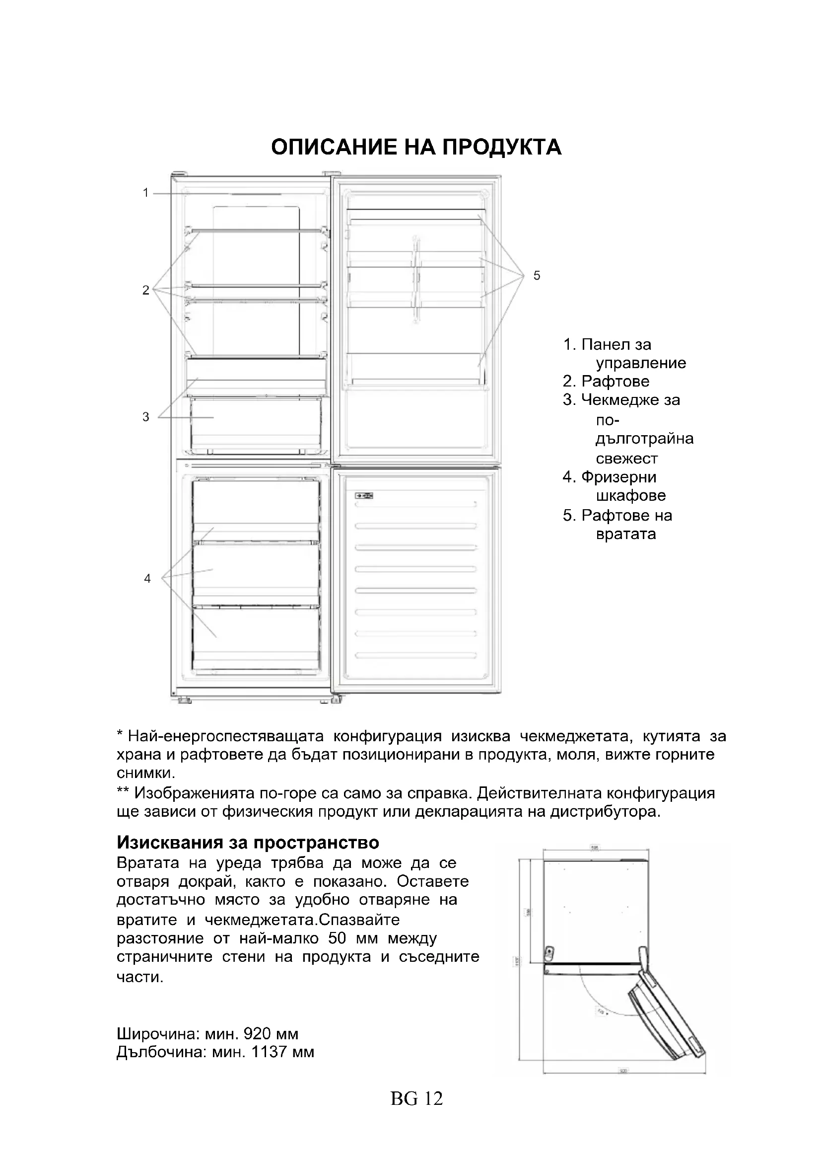 - Най-енергоспестяващата конфигурация изисква чекмеджетата, кутията за храна и рафтовете да бъдат позиционирани в продукта, моля, вижте горните