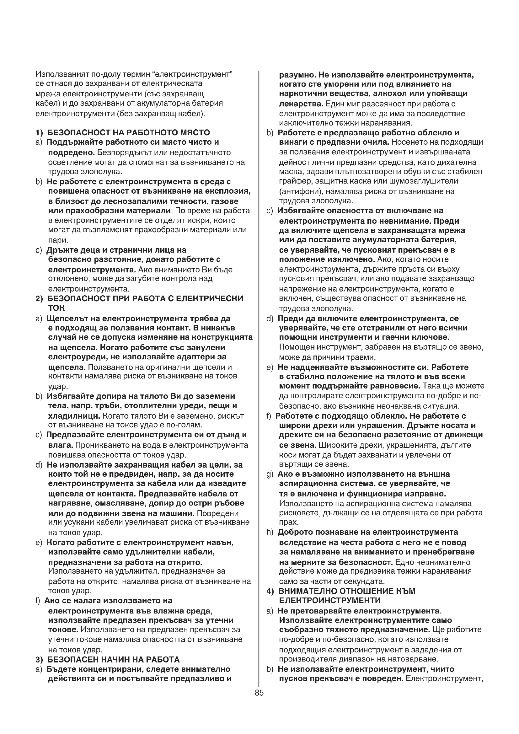 ЕЛЕКТРОИНСТРУМЕНТИ a) Не претоварвайте електроинструмента. Използвайте електроинструментите само съобразно тяхното предназначение. Ще работите по-добре и по-безопасно, когато използвате подходящия електроинструмент в зададения от производителя диапазон на натоварване. b) Не използвайте електроинструмент, чиито пусков прекъсвач е повреден. Електроинструмент, Използваният по-долу термин “електроинструмент” се отнася до захранвани от електрическата мрежа електроинструменти (със захранващ кабел) и до захранвани от акумулаторна батерия електроинструменти (без захранващ кабел).