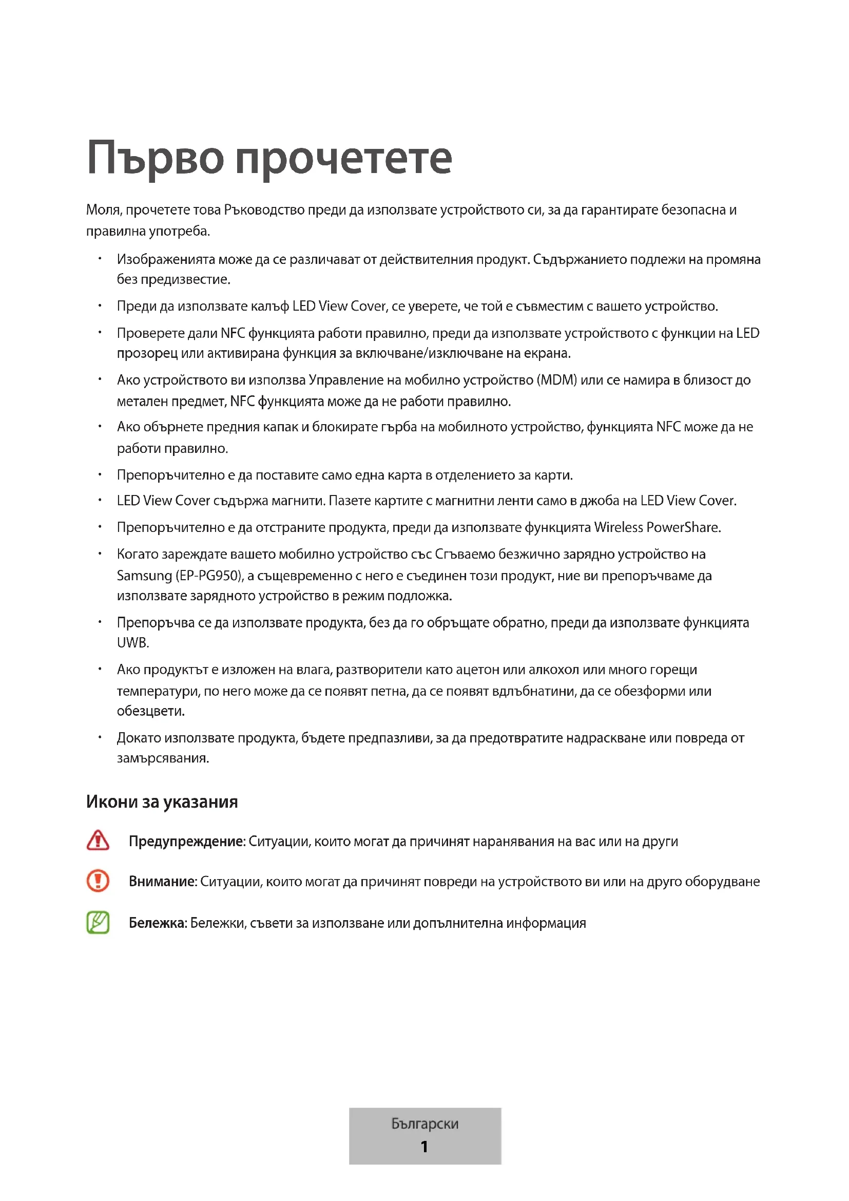 Първо прочетете Моля, прочетете това Ръководство преди да използвате устройството си, за да гарантирате безопасна и правилна употреба. Изображенията може да се различават от действителния продукт. Съдържанието подлежи на промяна без предизвестие. Преди да използвате калъф LED View Cover, се уверете, че той е съвместим с вашето устройство. Проверете дали NFC функцията работи правилно, преди да използвате устройството с функции на LED прозорец или активирана функция за включване/изключване на екрана. Ако устройството ви използва Управление на мобилно устройство (MDM) или се намира в близост до метален предмет, NFC функцията може да не работи правилно. Ако обърнете предния капак и блокирате гърба на мобилното устройство, функцията NFC може да не работи правилно. Препоръчително е да поставите само една карта в отделението за карти. LED View Cover съдържа магнити. Пазете картите с магнитни ленти само в джоба на LED View Cover. Препоръчително е да отстраните продукта, преди да използвате функцията Wireless PowerShare. Когато зареждате вашето мобилно устройство със Сгъваемо безжично зарядно устройство на Samsung (EP-PG950), а същевременно с него е съединен този продукт, ние ви препоръчваме да използвате зарядното устройство в режим подложка. Препоръчва се да използвате продукта, без да го обръщате обратно, преди да използвате функцията UWB.