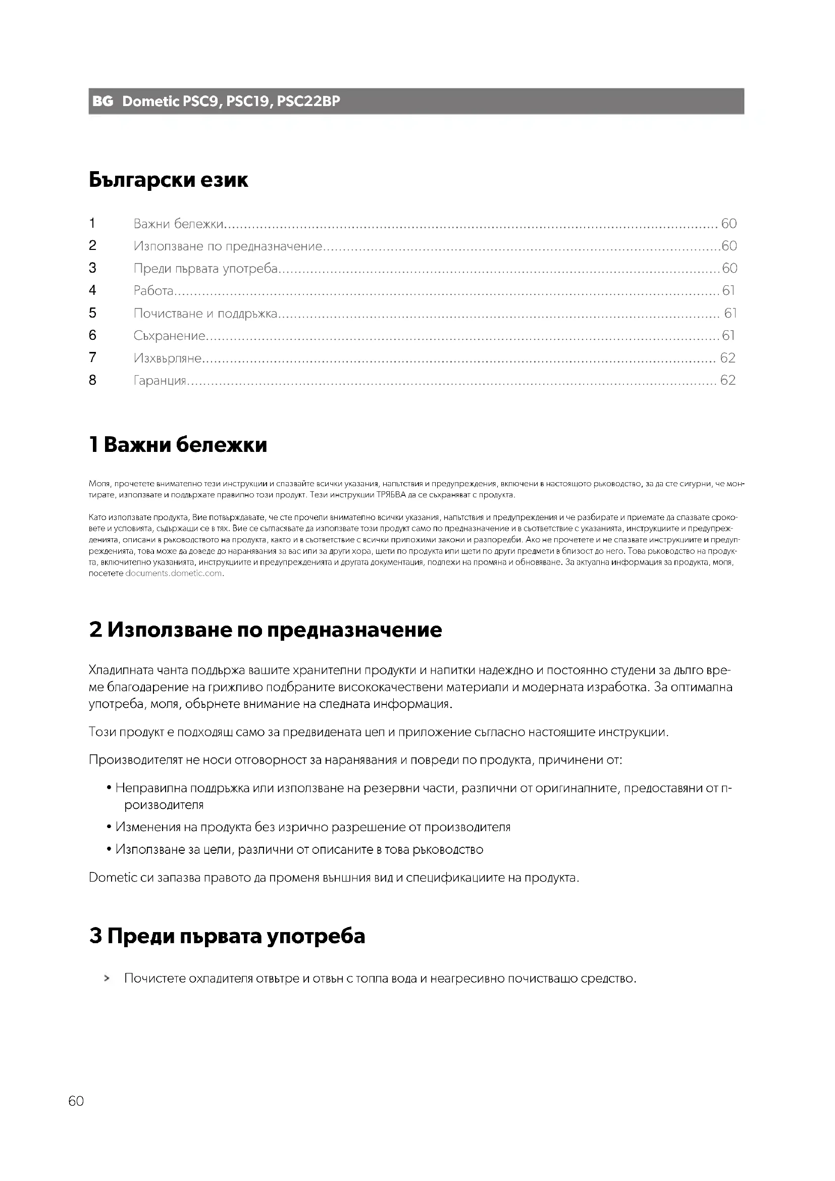 Гаранция..................................................................................................................................... 62 1 Важни бележки Моля, прочетете внимателно тези инструкции испазвайте всички указания, напътствия ипредупреждения, включени внастоящото ръководство, за да сте сигурни, че мон- тирате, използвате иподдържате правилно този продукт. Тези инструкции ТРЯБВА да се съхраняват с продукта. Като използвате продукта, Вие потвърждавате, че сте прочели внимателно всички указания, напътствия ипредупреждения иче разбирате иприемате да спазвате сроко- вете иусловията, съдържащи се втях. Вие се съгласявате да използвате този продукт само попредназначение ивсъответствие суказанията, инструкциите ипредупреж- денията, описани връководството напродукта, както ивсъответствие свсички приложими закони иразпоредби. Ако непрочетете инеспазвате инструкциите ипредуп- режденията, това може да доведе донаранявания за вас или за други хора, щети попродукта или щети подруги предмети вблизост донего. Това ръководство напродук- та, включително указанията, инструкциите ипредупрежденията идругата документация, подлежи напромяна иобновяване. За актуална информация за продукта, моля, посетете documents.dometic.com. 2 Използване по предназначение Хладилната чанта поддържа вашите хранителни продукти инапитки надеждно ипостоянно студени за дълго вре- ме благодарение нагрижливо подбраните висококачествени материали имодерната изработка. За оптимална употреба, моля, обърнете внимание наследната информация. Този продукт е подходящ само за предвидената цел и приложение съгласно настоящите инструкции. Производителят неноси отговорност за наранявания иповреди попродукта, причинени от: