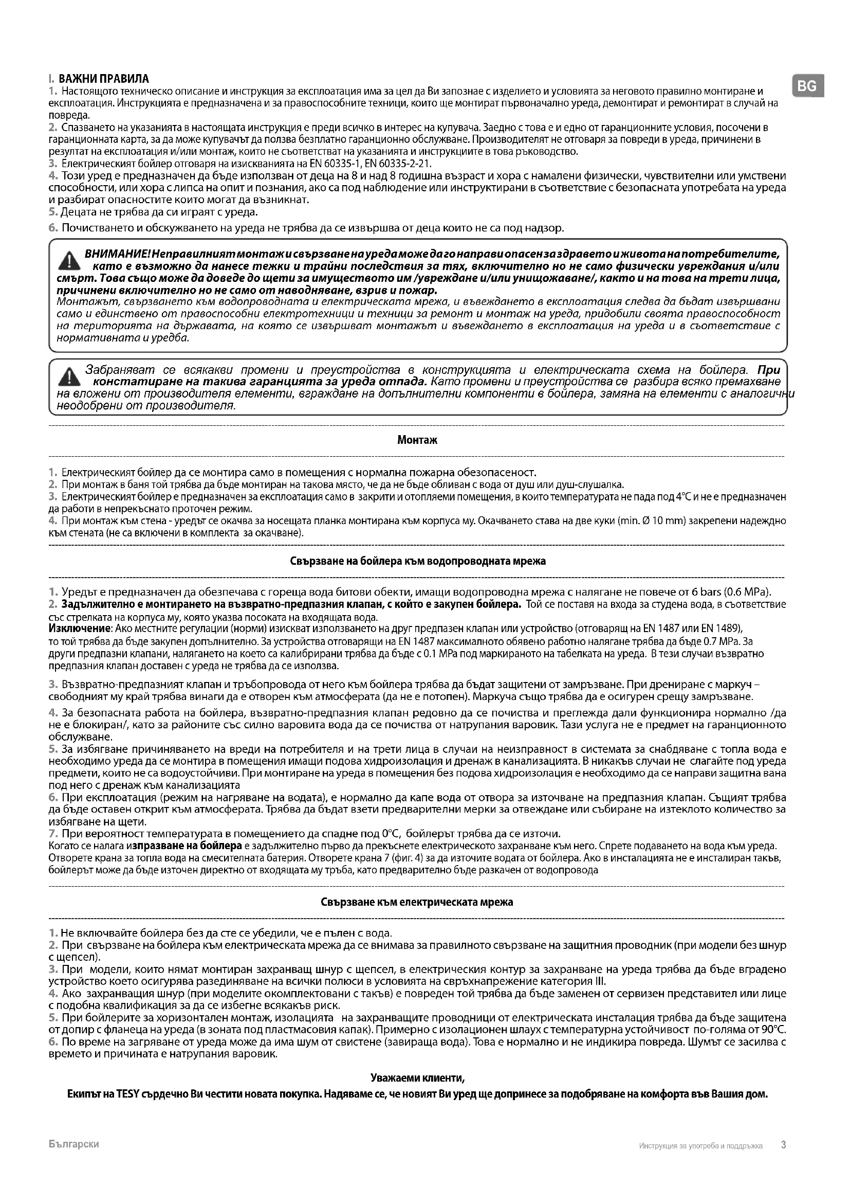 3. При модели, които нямат монтиран захранващ шнур с щепсел, в електрическия контур за захранване на уреда трябва да бъде вградено устройство което осигурява разединяване на всички полюси в условията на свръхнапрежение категория III. 4. Ако захранващия шнур (при моделите окомплектовани с такъв) е повреден той трябва да бъде заменен от сервизен представител или лице с подобна квалификация за да се избегне всякакъв риск. 5. При бойлерите за хоризонтален монтаж, изолацията на захранващите проводници от електрическата инсталация трябва да бъдe защитенa от допир с фланеца на уреда (в зоната под пластмасовия капак). Примерно с изолационен шлаух с температурна устойчивост по-голяма от 90°C. 6. По време на загряване от уреда може да има шум от свистене (завираща вода). Това е нормално и не индикира повреда. Шумът се засилва с времето и причината е натрупания варовик. Уважаеми клиенти, Екипът на TESY сърдечно Ви честити новата покупка. Надяваме се, че новият Ви уред ще допринесе за подобряване на комфорта във Вашия дом.4 Инструкция за употреба и поддръжка