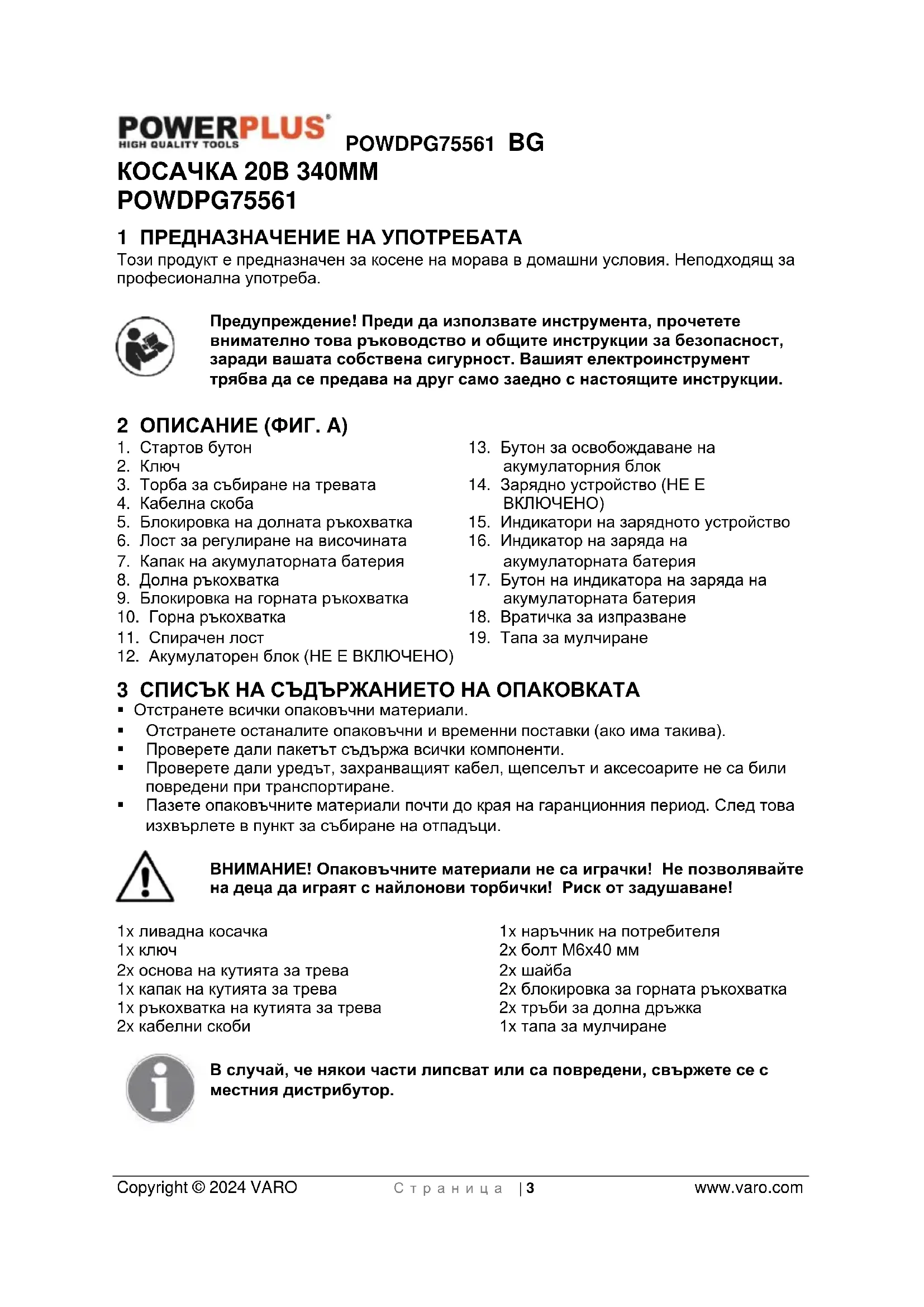 - Пазете опаковъчните материали почти до края на гаранционния период. След това изхвърлете в пункт за събиране на отпадъци. ВНИМАНИЕ! Опаковъчните материали не са играчки! Не позволявайте на деца да играят с найлонови торбички! Риск от задушаване! 1x ливадна косачка 1x ключ 2x основа на кутията за трева 1x капак на кутията за трева 1x ръкохватка на кутията за трева 2x кабелни скоби 1x наръчник на потребителя 2x болт M6x40 мм 2x шайба 2x блокировка за горната ръкохватка 2x тръби за долна дръжка 1x тапа за мулчиране В случай, че някои части липсват или са повредени, свържете се с местния дистрибутор.POWDPG75561 BG Copyright © 2024 VARO С т р а н и ц а | 4 www.varo.com 4 СИМВОЛИ В настоящия наръчник и/или върху машината са използвани следните символи: