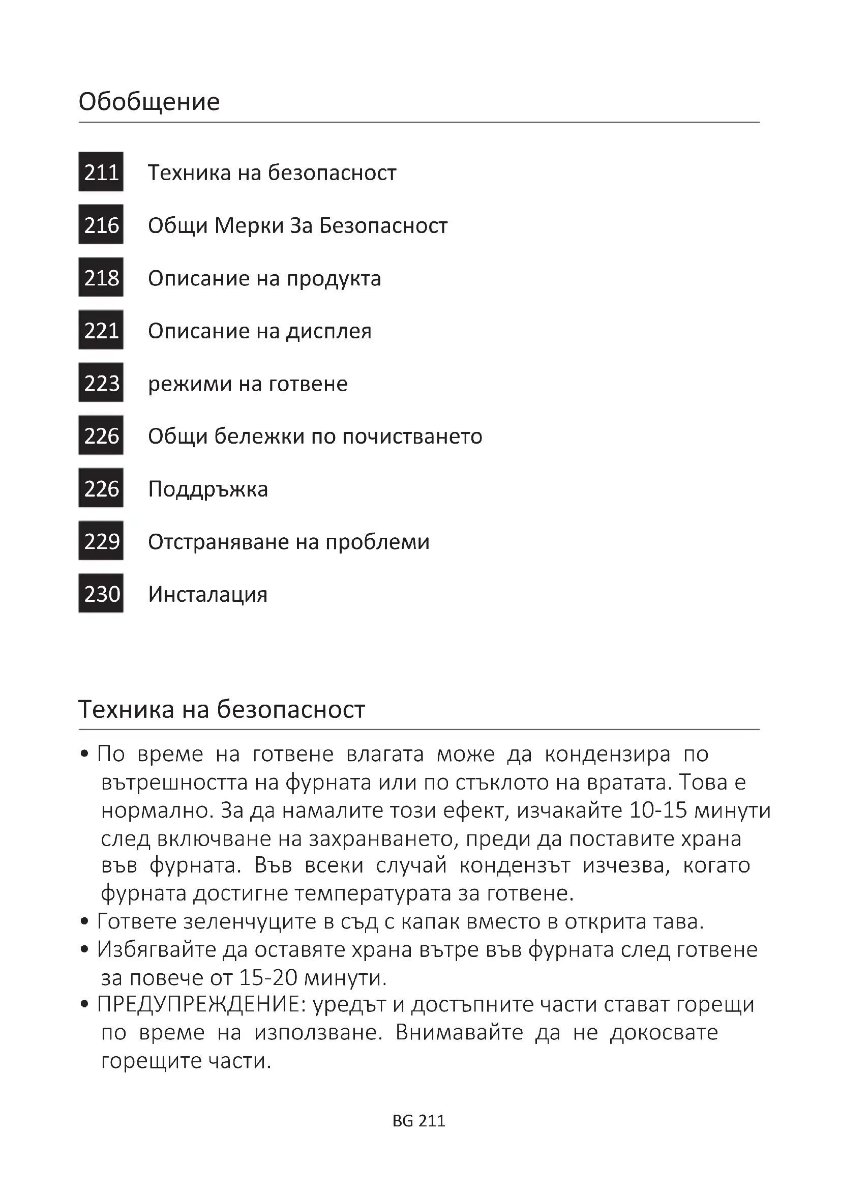 - Не използвайте силни абразивни почистващи препарати или остри метални стъргалки на съда с пара.BG 216 Общи Мерки За Безопасност Инструкции за безопасност Благодарим Ви, че избрахте един от нашите продукти. За да имате възможно най- добър резултат при използването на фурната, внимателно прочетете това ръководство. Препоръчваме Ви да запазите настоящото ръководство за монтаж и експлоатация и при нужда да се обръщате към него. Когато уредът е в експлоатация всички достъпни части са горещи. Внивайте да не се докосвате до тези елементи. При първият пуск на фурната, може да се усети неприятна миризма. Това става защото изолационните елементи се загряват за първи път. Това е абсолютно нормално и няма повод за притеснение. Изчакайте уреда да изстине и го забършете добре. След това е готов за нормална експлоатация. Една фурна по своята същност на работа става много гореща. Особено стъклото на вратата на фурната. Използвайте фурната единствено по предназначение - само за приготвяне на храна. Всяка друга употреба, например като източник на топлина, се смята за неправилна и следователно опасна. Производителят не носи отговорност за щети, възникнали вследствие на неуместната, неправилната или неразумната употреба на фурната. Използването на всеки един електроуред предполага спазването на някои основни правила: - Не изключвайте от контакта, като дърпате кабела. - Не докосвайте уреда с мокри или влажни ръце или крака. - Не се препоръчва използването на адаптери, разклонители и удължители. В случай на повреда и/или не недобра работа, изключете уреда и не се опитвайте да го поправите сами. Електрическа безопасност УВЕРЕТЕ СЕ, ЧЕ СВЪРЗВАНЕТО НА ЕЛЕКТРИЧЕСКИТЕ КАБЕЛИ СЕ ИЗВЪРШВА ОТ ЕЛЕКТРОТЕХНИК ИЛИ КВАЛИФИЦИРАН ТЕХНИК. Електрическата инсталация, към която е свързана фурната, трябва да отговаря на изискванията на приложимото законодателство в страната, в която се ползва уредът. Производителят не носи отговорност за щети, причинени от неспазването на тези указания. Фурната трябва да бъде свързана към електрозахранване със заземено контактно гнездо или многополюсен прекъсвач, в зависимост от приложимото законодателство в страната, в която се извършва монтажът. Електрозахранващата инсталация трябва да бъде защитена с подходящи предпазители, а използваните проводници трябва да имат напречно сечение, подходящо за провеждане на тока, необходим за захранване на