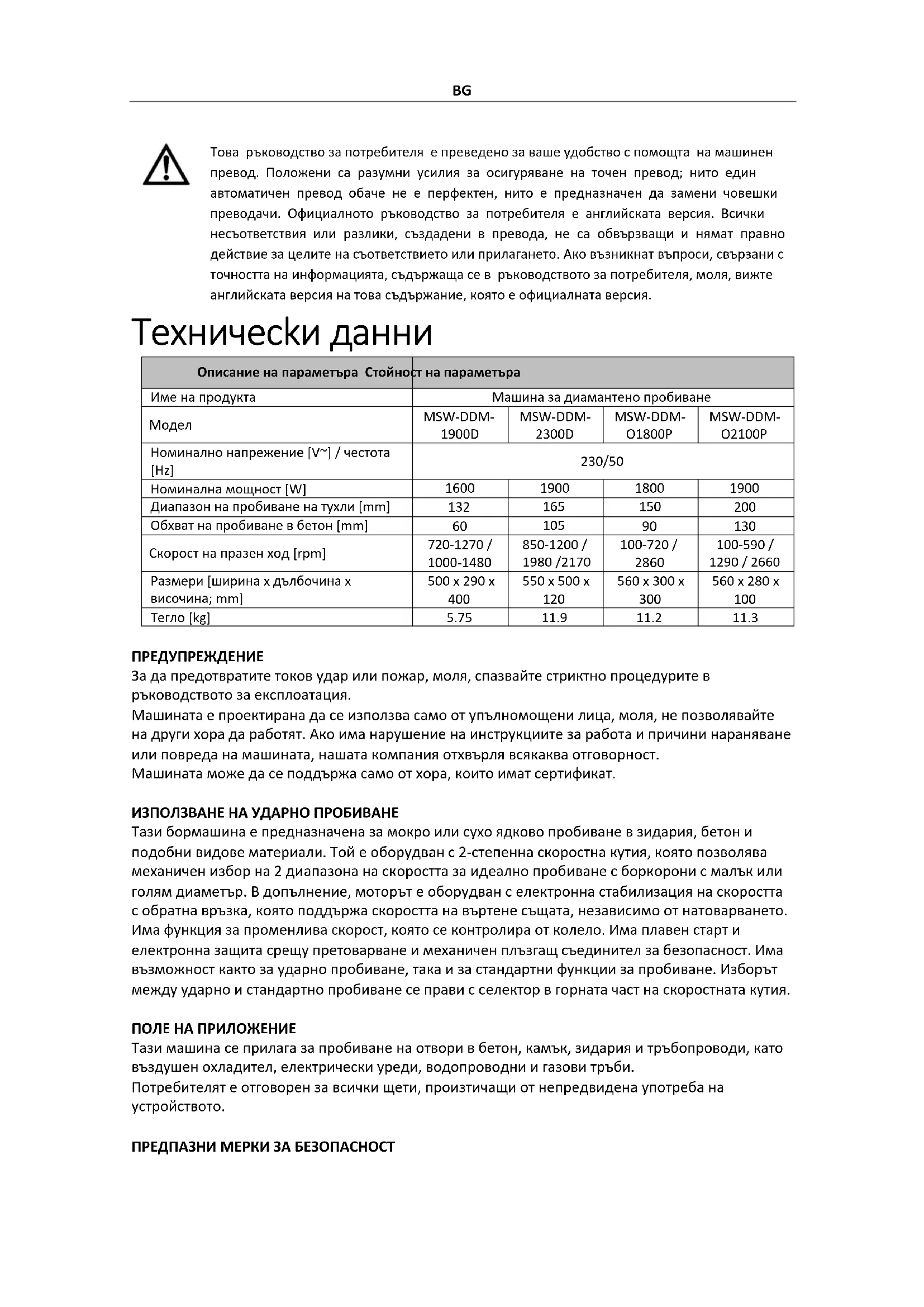 ПРЕДУПРЕЖДЕНИЕ За да предотвратите токов удар или пожар, моля, спазвайте стриктно процедурите в ръководството за експлоатация. Машината е проектирана да се използва само от упълномощени лица, моля, не позволявайте на други хора да работят. Ако има нарушение на инструкциите за работа и причини нараняване или повреда на машината, нашата компания отхвърля всякаква отговорност. Машината може да се поддържа само от хора, които имат сертификат. ИЗПОЛЗВАНЕ НА УДАРНО ПРОБИВАНЕ Тази бормашина е предназначена за мокро или сухо ядково пробиване в зидария, бетон и подобни видове материали. Той е оборудван с 2-степенна скоростна кутия, която позволява механичен избор на 2 диапазона на скоростта за идеално пробиване с боркорони с малък или голям диаметър. В допълнение, моторът е оборудван с електронна стабилизация на скоростта с обратна връзка, която поддържа скоростта на въртене същата, независимо от натоварването. Има функция за променлива скорост, която се контролира от колело. Има плавен старт и електронна защита срещу претоварване и механичен плъзгащ съединител за безопасност. Има възможност както за ударно пробиване, така и за стандартни функции за пробиване. Изборът между ударно и стандартно пробиване се прави с селектор в горната част на скоростната кутия. ПОЛЕ НА ПРИЛОЖЕНИЕ Тази машина се прилага за пробиване на отвори в бетон, камък, зидария и тръбопроводи, като въздушен охладител, електрически уреди, водопроводни и газови тръби. Потребителят е отговорен за всички щети, произтичащи от непредвидена употреба на устройството. ПРЕДПАЗНИ МЕРКИ ЗА БЕЗОПАСНОСТBG ◆ Прочетете всички предпазни мерки преди работа. ◆ Моля, следвайте стриктно инструкциите за експлоатация, неспазването на тези предпазни мерки и инструкции за безопасност може да причини токов удар, пожар и/или тежки наранявания.