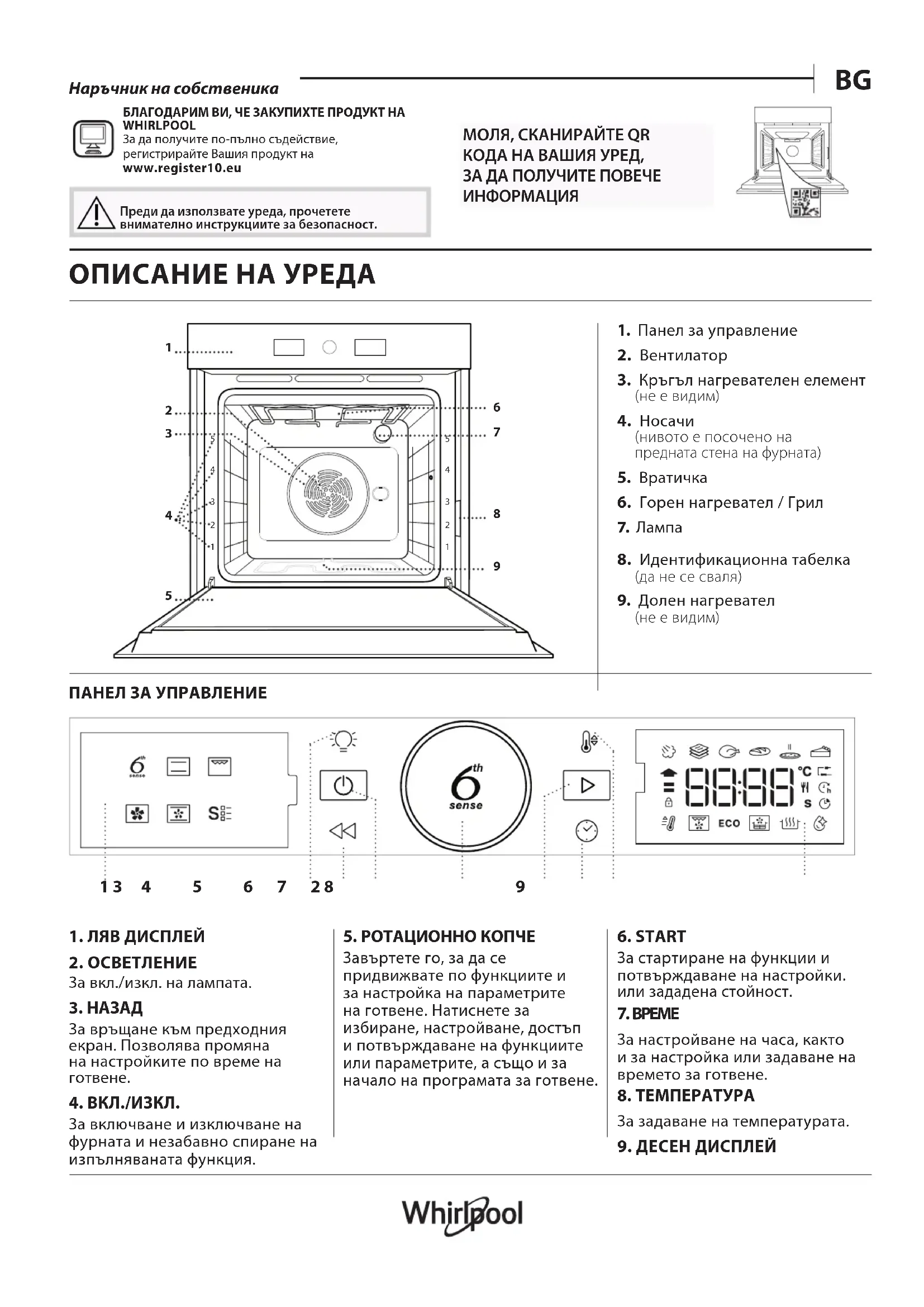 - Alternatively, contact our After-sales Service (See phone number in the warranty booklet). When contacting our After- sales Service, please state the codes provided on your product's identi cation plate. ®/TM/© 2025 Whirlpool. Produced under license.BG Наръчник на собственика БЛАГОДАРИМ ВИ, ЧЕ ЗАКУПИХТЕ ПРОДУКТ НА WHIRLPOOL За да получите по-пълно съдействие, регистрирайте Вашия продукт на www.register10.eu Преди да използвате уреда, прочетете внимателно инструкциите за безопасност. ОПИСАНИЕ НА УРЕДА ПАНЕЛ ЗА УПРАВЛЕНИЕ
