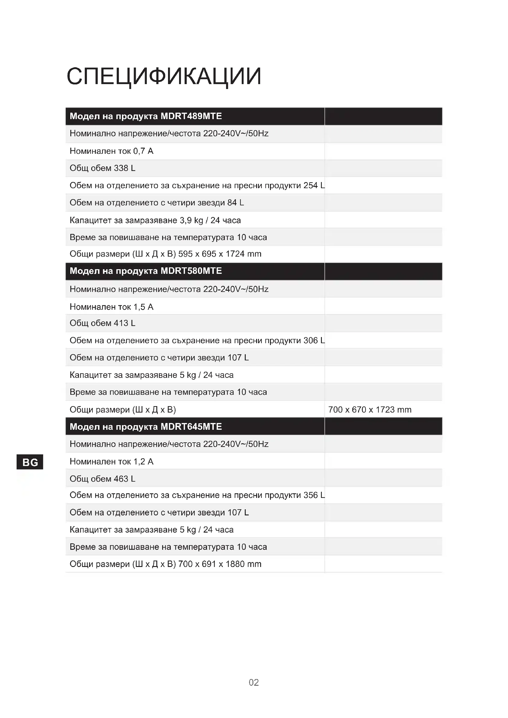 СПЕЦИФИКАЦИИ Модел на продукта MDRT580MTE Номинално напрежение/честота 220-240V~/50Hz Номинален ток 1,5 A Общ обем 413 L Обем на отделението за съхранение на пресни продукти 306 L Обем на отделението с четири звезди 107 L Капацитет за замразяване 5 kg / 24 часа Време за повишаване на температурата 10 часа Общи размери (Ш x Д x В) 700 x 670 x 1723 mm Модел на продукта MDRT645MTE Номинално напрежение/честота 220-240V~/50Hz Номинален ток 1,2 A Общ обем 463 L Обем на отделението за съхранение на пресни продукти 356 L Обем на отделението с четири звезди 107 L Капацитет за замразяване 5 kg / 24 часа Време за повишаване на температурата 10 часа Общи размери (Ш x Д x В) 700 x 691 x 1880 mm Модел на продукта MDRT489MTE Номинално напрежение/честота 220-240V~/50Hz Номинален ток 0,7 A Общ обем 338 L Обем на отделението за съхранение на пресни продукти 254 L Обем на отделението с четири звезди 84 L Капацитет за замразяване 3,9 kg / 24 часа Време за повишаване на температурата 10 часа Общи размери (Ш x Д x В) 595 x 695 x 1724 mm03