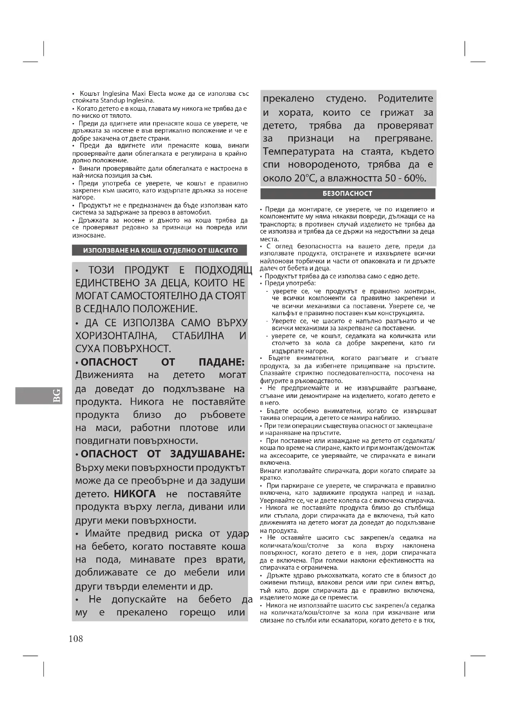 - за децата. Винаги проверявайте дали около лицето на детето има достатъчно пространство, за да избегнете възпрепятстване на въздушния поток. Връзките могат да причинят удушаване. Не поставяйте предмети с връзки около врата на детето (като шнурове или панделки на дрехи или залъгалки). Не закачайте връзки над продукта и не ги закачайте за играчки. Не оставяйте меки предмети, плюшени играчки, протектори и ограничители в коша, където детето спи, защото могат да се окажат опасни.108