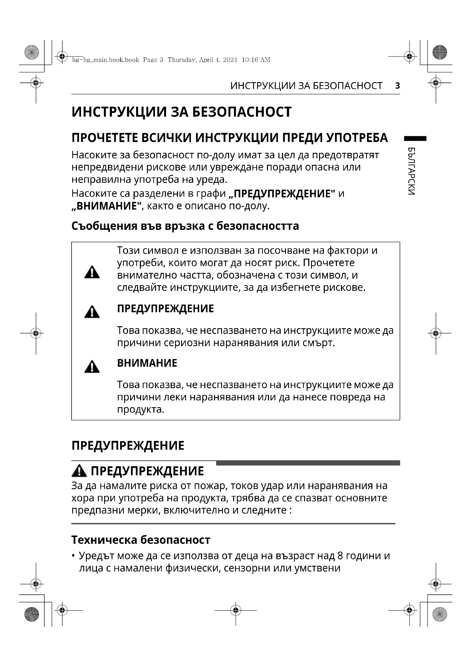bg-bg_main.book.book Page 3 Thursday, April 4, 2024 10:16 AM4 ИНСТРУКЦИИ ЗА БЕЗОПАСНОСТ способности или липса на опит и знания, ако са под наблюдение или да получават инструкции относно употребата на уреда по безопасен начин, разбирайки възможните опасности. Деца не трябва да си играят с уреда. Почистването и поддръжката не трябва да се извършват от деца без надзор.