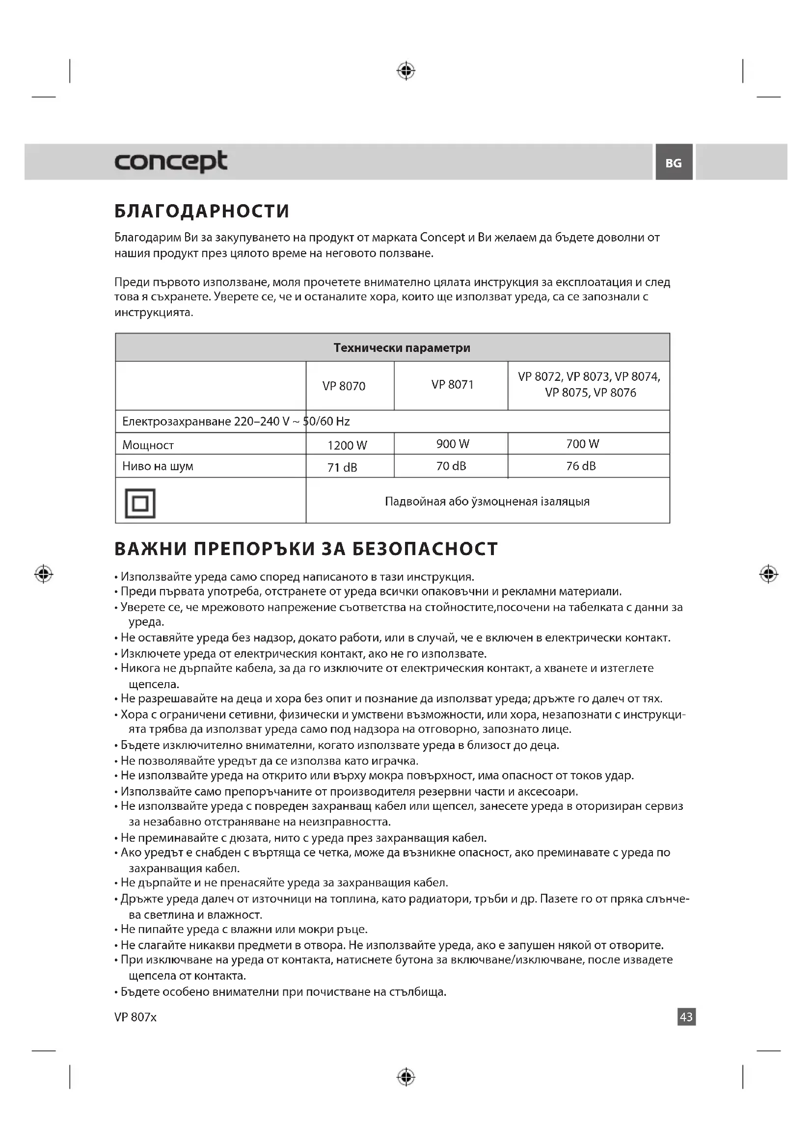 БЛАГОДАРНОСТИ Благодарим Ви за закупуването на продукт от марката Concept и Ви желаем да бъдете доволни от нашия продукт през цялото време на неговото ползване. Преди първото използване, моля прочетете внимателно цялата инструкция за експлоатация и след това я съхранете. Уверете се, че и останалите хора, които ще използват уреда, са се запознали с инструкцията. ВАЖНИ ПРЕПОРЪКИ ЗА БЕЗОПАСНОСТ