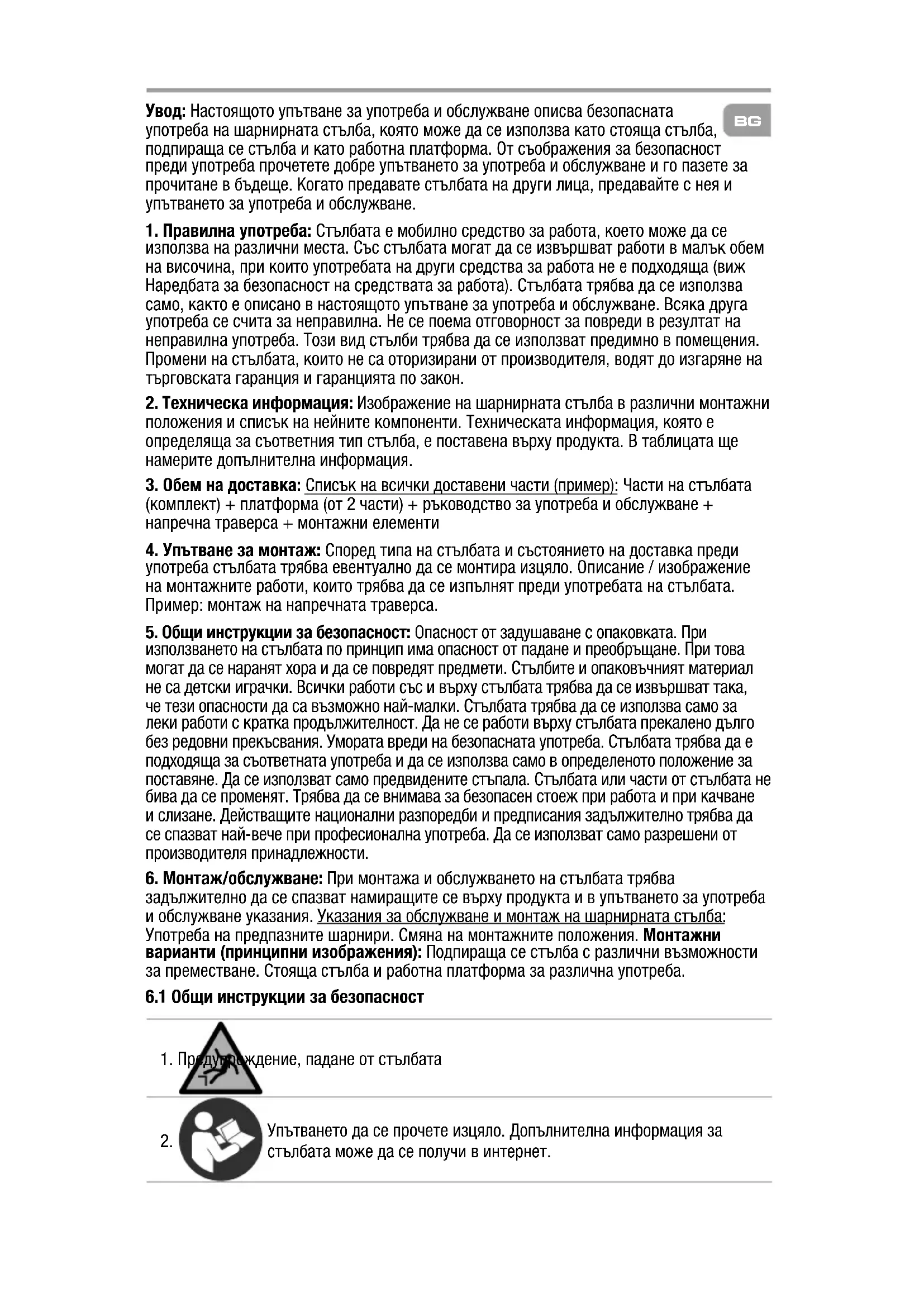 Instrukcja obsługi i użytkowania Czy wszystkie oznakowania drabiny oraz instrukcja obsługi są umieszczone i czytelne? WYNIK Drabina jest w porządku i może być dalej używana. Drabina może być używana dopiero po wykonaniu naprawy. Drabina jest uszkodzona i musi zostać usunięta.Увод: Настоящото упътване за употреба и обслужване описва безопасната употреба на шарнирната стълба, която може да се използва като стояща стълба, подпираща се стълба и като работна платформа. От съображения за безопасност преди употреба прочетете добре упътването за употреба и обслужване и го пазете за прочитане в бъдеще. Когато предавате стълбата на други лица, предавайте с нея и упътването за употреба и обслужване.