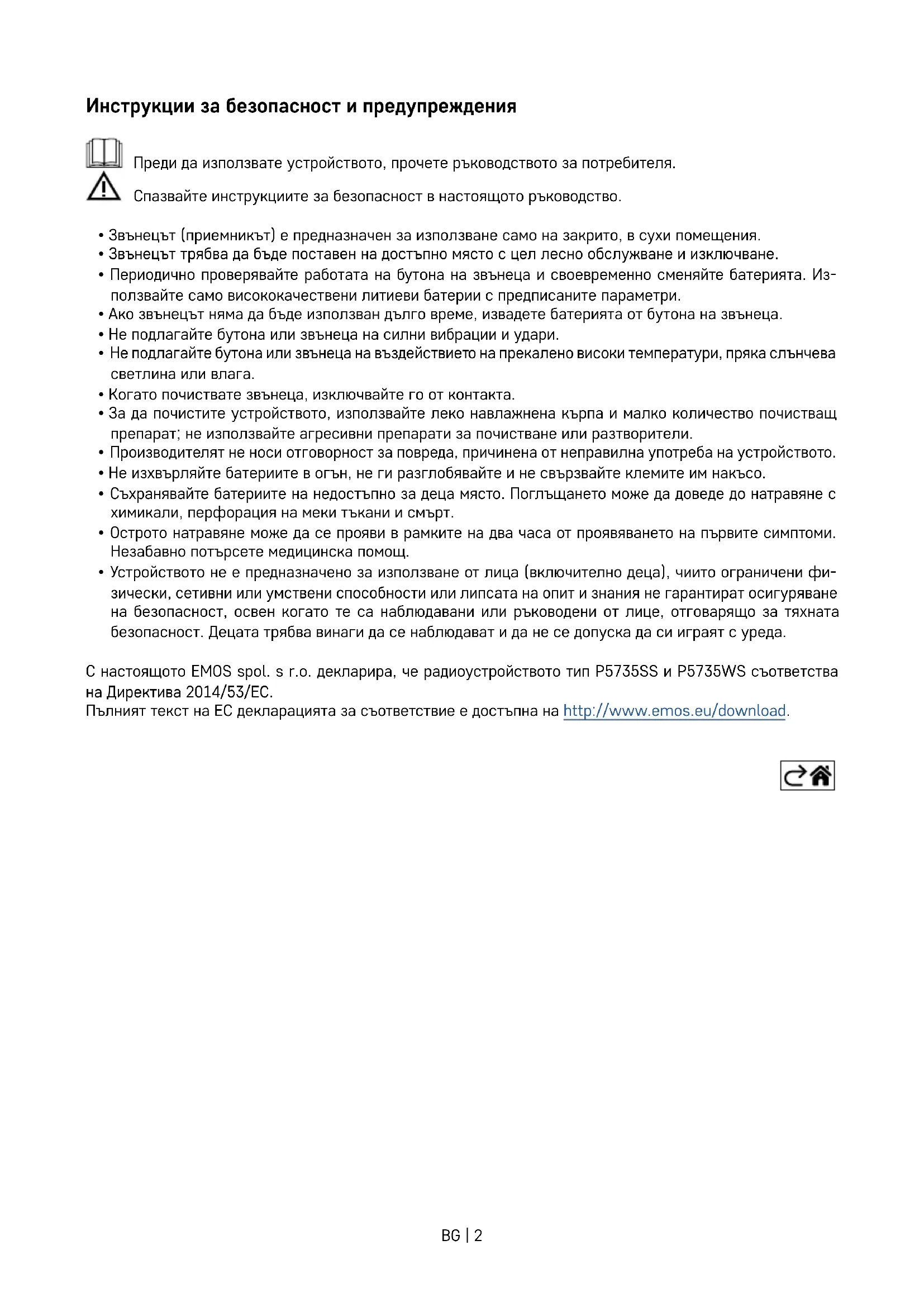 - Устройството не е предназначено за използване от лица (включително деца), чиито ограничени фи- зически, сетивни или умствени способности или липсата на опит и знания не гарантират осигуряване на безопасност, освен когато те са наблюдавани или ръководени от лице, отговарящо за тяхната безопасност. Децата трябва винаги да се наблюдават и да не се допуска да си играят с уреда. С настоящото EMOS spol. s r.o. декларира, че радиоустройството тип P5735SS и P5735WS съответства на Директива 2014/53/ЕС. Пълният текст на ЕС декларацията за съответствие е достъпна на http://www.emos.eu/download.BG | 3 80 mm 38 mm 19 mm 65 mm 80 mm 92 mm Технически характеристики Диапазон на предаване: до 150 m на открито (може да спадне до пет пъти в натоварени