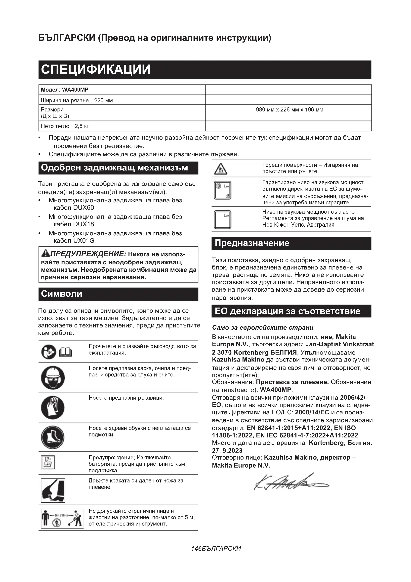 Недопускайтестраничнилицаи животнинаразстояние,по-малкоот5м, отелектрическияинструмент. Горещиповърхности–Изгарянияна пръститеилиръцете. Гарантиранонивоназвуковамощност съгласнодирективатанаЕСзашумо- витеемисиинасъоръжения,предназна- ченизаупотребаизвънсградите. Нивоназвуковамощностсъгласно Регламентазауправлениенашумана НовЮженУелс,Австралия Предназначение Тазиприставка,заедносодобрензахранващ блок,епредназначенаединственозаплевенена трева,растящапоземята.Никоганеизползвайте приставкатазадругицели.Неправилнотоизполз- ваненаприставкатаможедадоведедосериозни наранявания. ЕО декларация за съответствие Само за европейските страни Вкачествотосинапроизводители:ние, Makita Europe N.V.,търговскиадрес:Jan-Baptist Vinkstraat 2 3070 Kortenberg БЕЛГИЯ.Упълномощаваме Kazuhisa Makinoдасъставитехническатадокумен- тацияидекларираменасвояличнаотговорност,че продуктът(ите); Обозначение:Приставка за плевене.Обозначение натипа(овете):WA400MP. Отговарянавсичкиприложимиклаузина2006/42/ ЕО,същоинавсичкиприложимиклаузинаследва- щитеДирективинаЕО/ЕС:2000/14/ECисапроиз- веденивсъответствиесъсследнитехармонизирани стандарти:EN 62841-1:2015+A11:2022, EN ISO 11806-1:2022, EN IEC 62841-4-7:2022+A11:2022. Мястоидатанадекларацията:Kortenberg, Белгия.