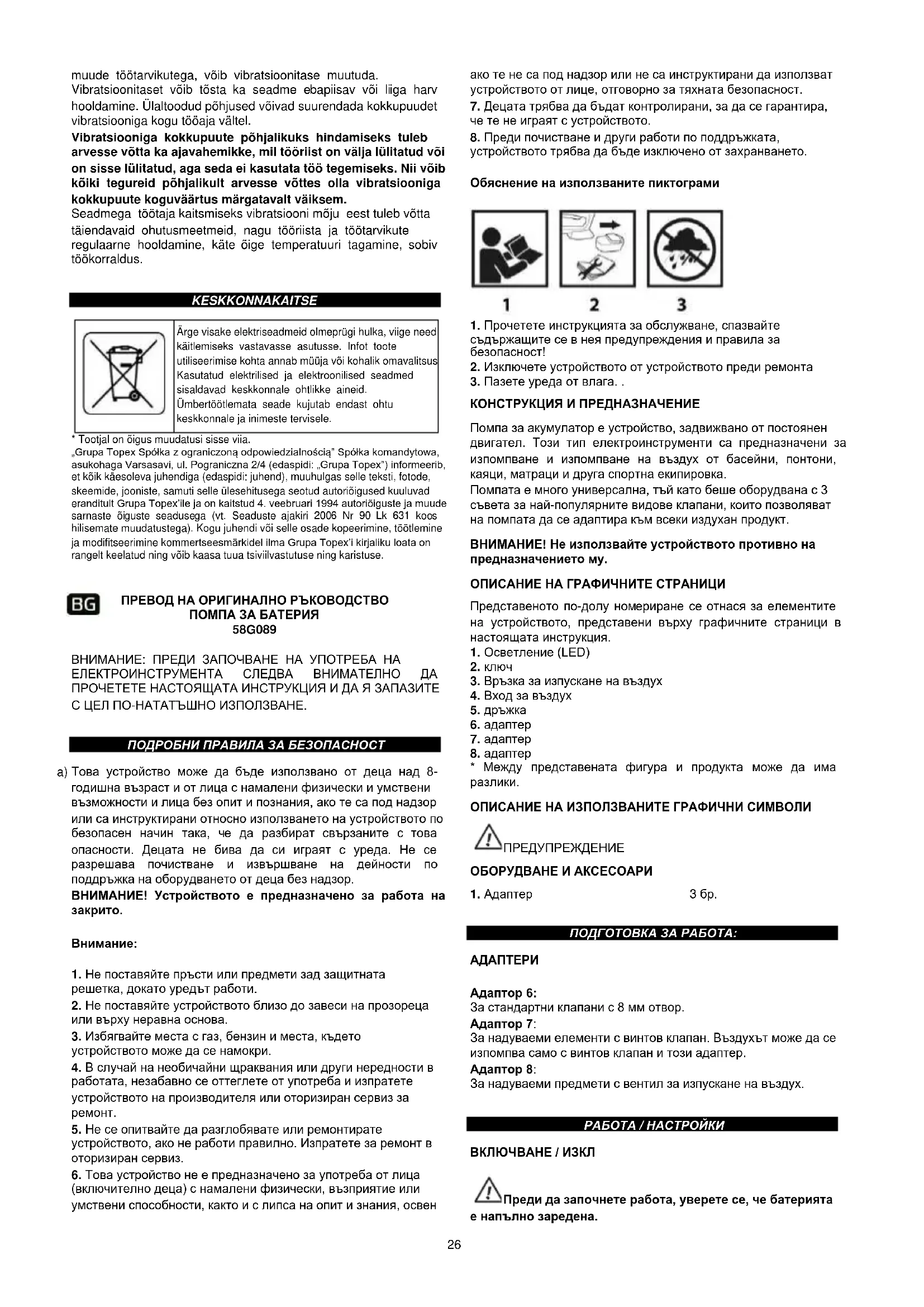 ПРЕВОД НА ОРИГИНАЛНО РЪКОВОДСТВО ПОМПА ЗА БАТЕРИЯ 58G089 ВНИМАНИЕ: ПРЕДИ ЗАПОЧВАНЕ НА УПОТРЕБА НА ЕЛЕКТРОИНСТРУМЕНТА СЛЕДВА ВНИМАТЕЛНО ДА ПРОЧЕТЕТЕ НАСТОЯЩАТА ИНСТРУКЦИЯ И ДА Я ЗАПАЗИТЕ С ЦЕЛ ПО-НАТАТЪШНО ИЗПОЛЗВАНЕ. ПОДРОБНИ ПРАВИЛА ЗА БЕЗОПАСНОСТ a) Това устройство може да бъде използвано от деца над 8- годишна възраст и от лица с намалени физически и умствени възможности и лица без опит и познания, ако те са под надзор или са инструктирани относно използването на устройството по безопасен начин така, че да разбират свързаните с това опасности. Децата не бива да си играят с уреда. Не се разрешава почистване и извършване на дейности по поддръжка на оборудването от деца без надзор. ВНИМАНИЕ! Устройството е предназначено за работа на