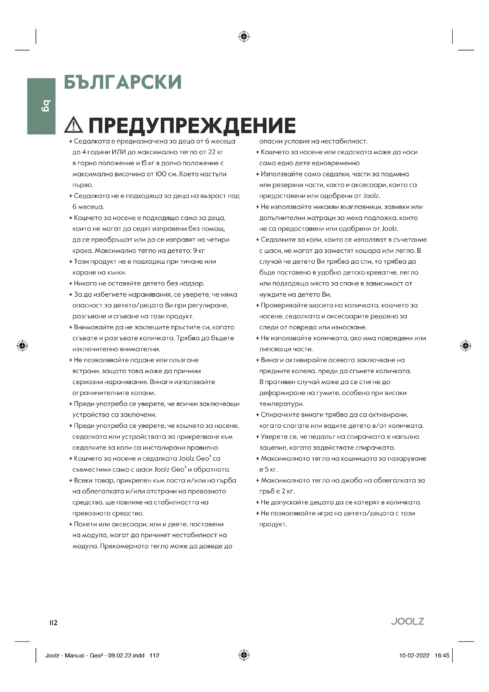 + Използвайте само матрака, който се продава с това детско креватче, не добавяйте втори матрак, тъй като това може да доведе до рискове от задушаване. Joolz - Manual - Geo³ - 09.02.22.indd 113Joolz - Manual - Geo³ - 09.02.22.indd 113 10-02-2022 16:4510-02-2022 16:45114