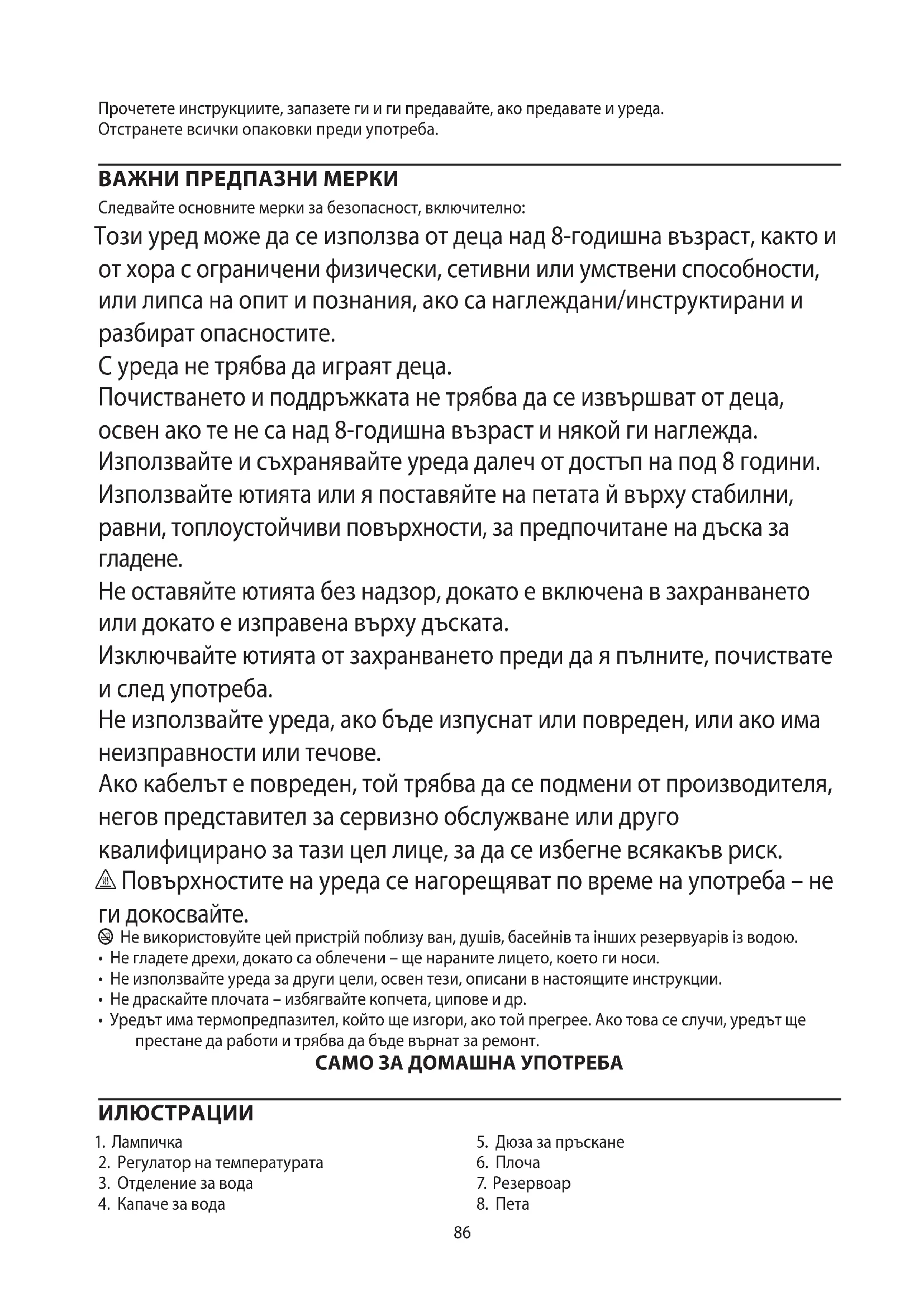AE86 Прочетете инструкциите, запазете ги и ги предавайте, ако предавате и уреда. Отстранете всички опаковки преди употреба. ВАЖНИ ПРЕДПАЗНИ МЕРКИ Следвайте основните мерки за безопасност, включително: Този уред може да се използва от деца над 8-годишна възраст, както и от хора с ограничени физически, сетивни или умствени способности, или липса на опит и познания, ако са наглеждани/инструктирани и разбират опасностите. С уреда не трябва да играят деца. Почистването и поддръжката не трябва да се извършват от деца, освен ако те не са над 8-годишна възраст и някой ги наглежда. Използвайте и съхранявайте уреда далеч от достъп на под 8 години. Използвайте ютията или я поставяйте на петата й върху стабилни, равни, топлоустойчиви повърхности, за предпочитане на дъска за