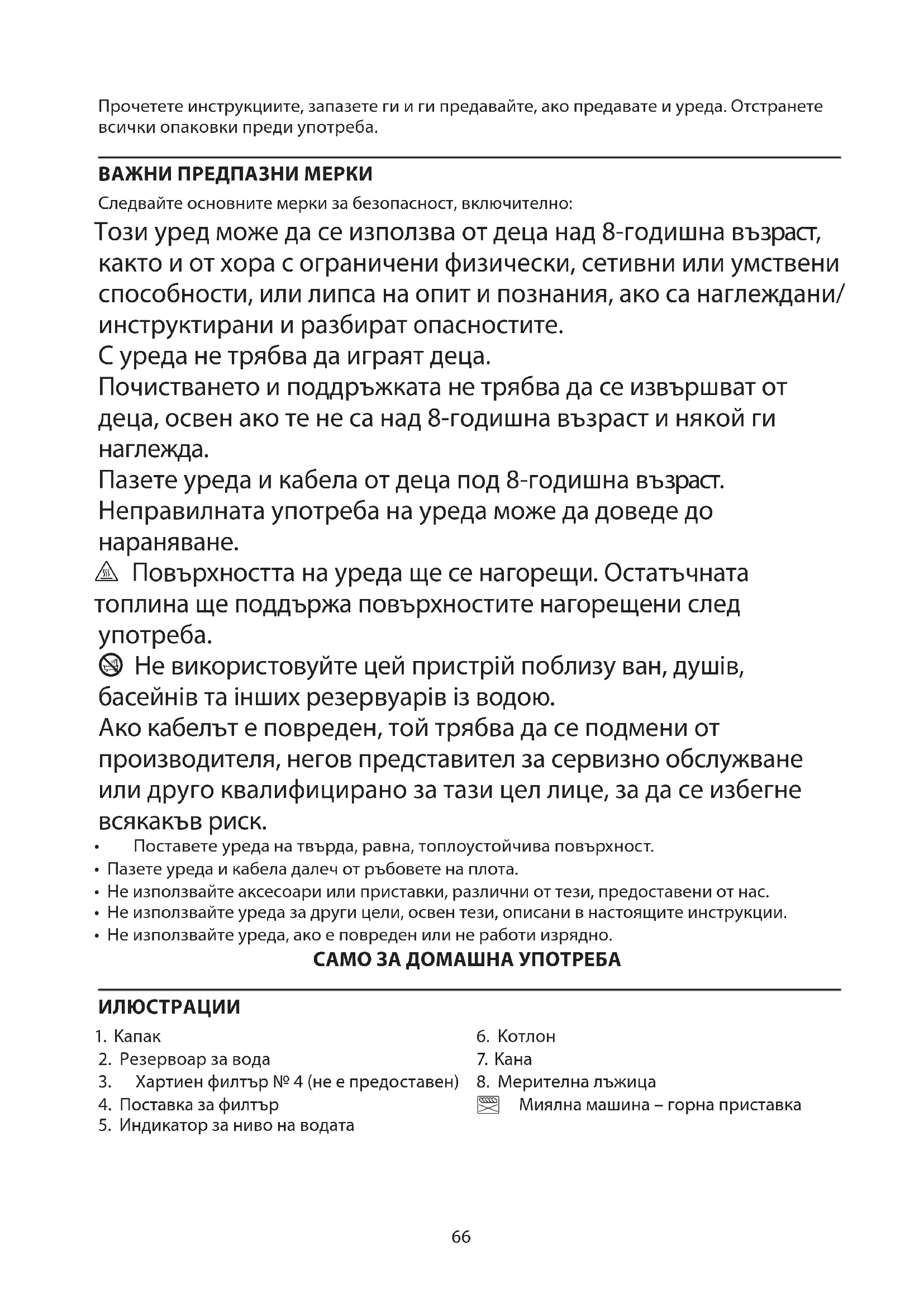 AE66 Прочетете инструкциите, запазете ги и ги предавайте, ако предавате и уреда. Отстранете всички опаковки преди употреба. ВАЖНИ ПРЕДПАЗНИ МЕРКИ Следвайте основните мерки за безопасност, включително: Този уред може да се използва от деца над 8-годишна възраст, както и от хора с ограничени физически, сетивни или умствени способности, или липса на опит и познания, ако са наглеждани/ инструктирани и разбират опасностите. С уреда не трябва да играят деца. Почистването и поддръжката не трябва да се извършват от деца, освен ако те не са над 8-годишна възраст и някой ги