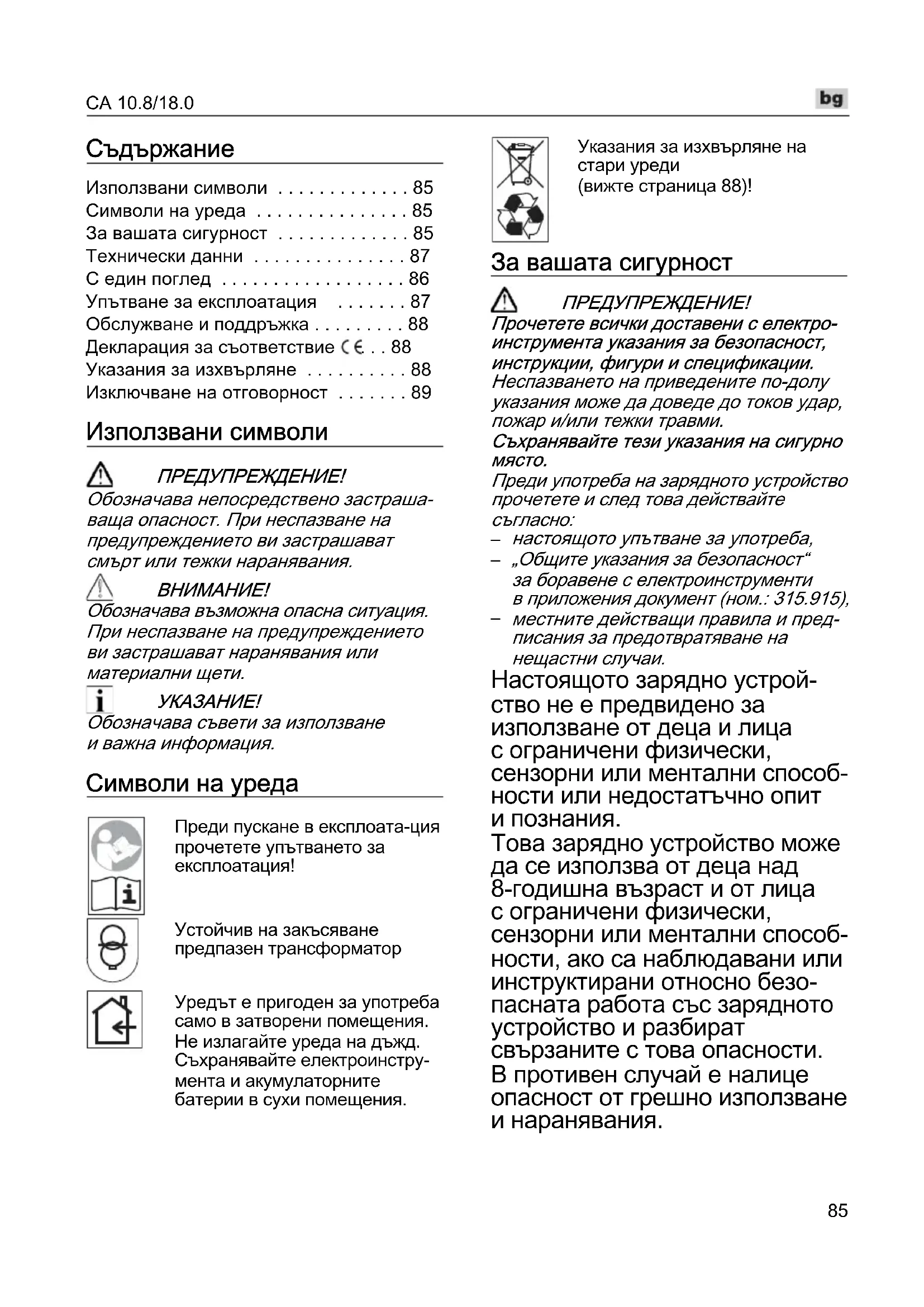 местните действащи правила и пред- писания за предотвратяване на нещастни случаи. Настоящото зарядно устрой- ство не е предвидено за използване от деца и лица с ограничени физически, сензорни или ментални способ- ности или недостатъчно опит и познания. Това зарядно устройство може да се използва от деца над 8-годишна възраст и от лица с ограничени физически, сензорни или ментални способ- ности, ако са наблюдавани или инструктирани относно безо- пасната работа със зарядното устройство и разбират свързаните с това опасности. В противен случай е налице опасност от грешно използване и наранявания.CA 10.8/18.0