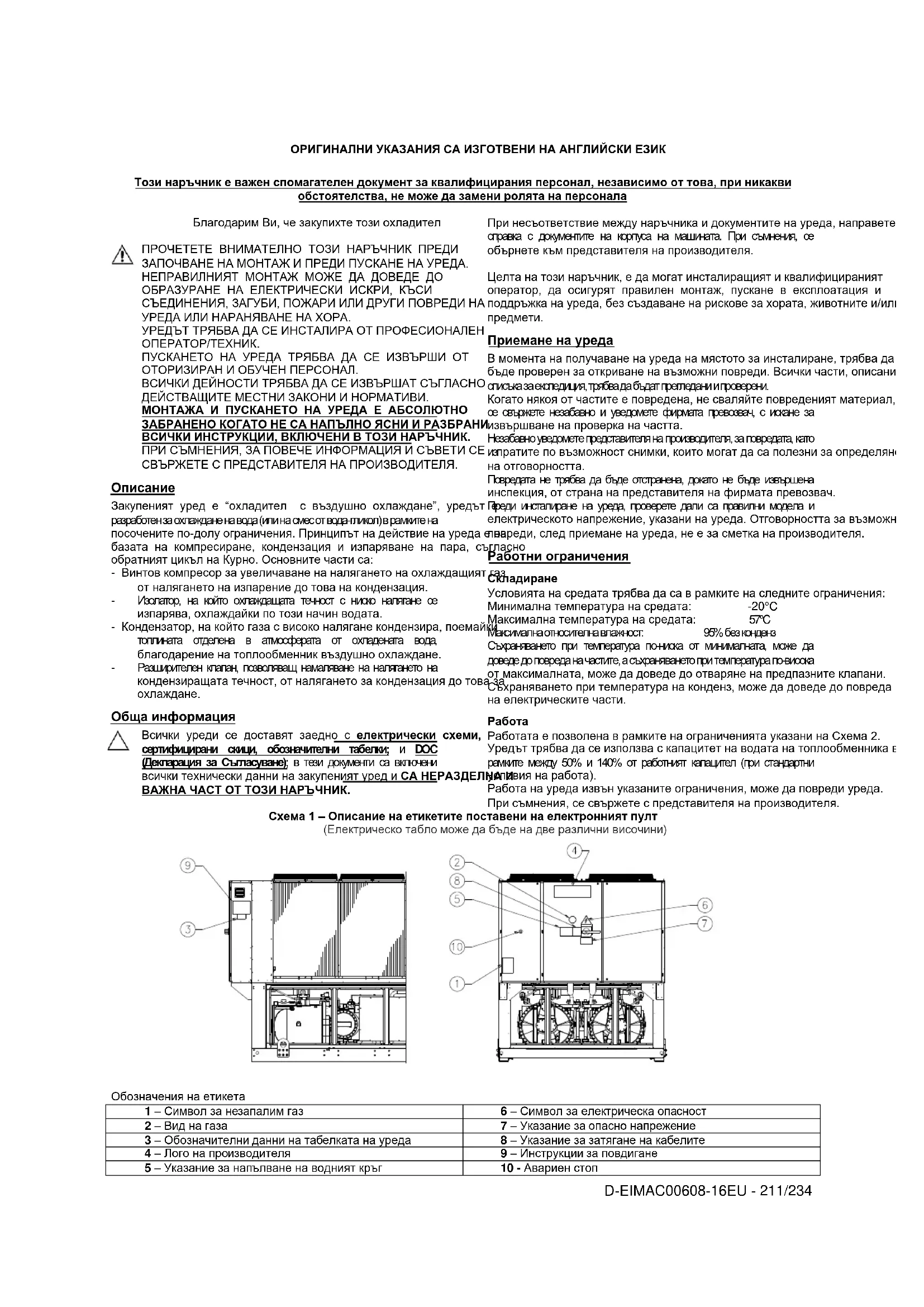 Обозначения на етикета 1 – Символ за незапалим газ 6 – Символ за електрическа опасност 2 – Вид на газа 7 – Указание за опасно напрежение 3 – Обозначителни данни на табелката на уреда 8 – Указание за затягане на кабелите 4 – Лого на производителя 9 – Инструкции за повдигане 5 – Указание за напълване на водният кръг