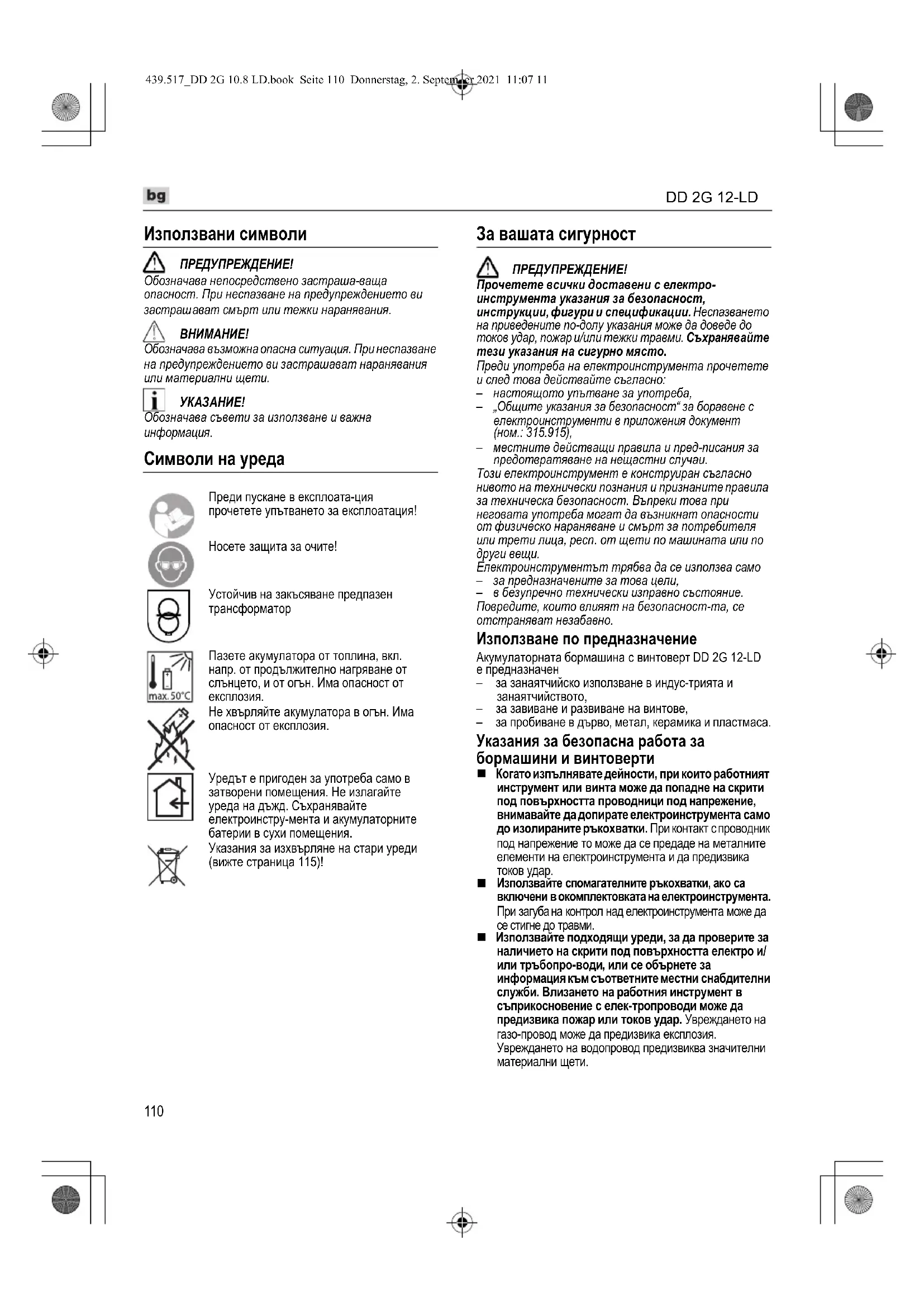 Обозначава съвети за използване иважна информация. Символи на уреда За вашата сигурност ПРЕДУПРЕЖДЕНИЕ! Прочетете всички доставени с електро- инструмента указания за безопасност, инструкции, фигури и спецификации. Неспазването на приведените по-долу указания може да доведе до токов удар, пожар и/или тежки травми. Съхранявайте тези указания на сигурно място. Преди употреба на електроинструмента прочетете и след това действайте съгласно: – настоящото упътване за употреба, – „Общите указания за безопасност“ за боравене с електроинструменти в приложения документ (ном.: 315.915), – местните действащи правила и пред-писания за предотвратяване на нещастни случаи. Този електроинструмент е конструиран съгласно нивото на технически познания и признаните правила за техническа безопасност. Въпреки това при неговата употреба могат да възникнат опасности от физическо нараняване и смърт за потребителя или трети лица, респ. от щети по машината или по други вещи. Електроинструментът трябва да се използва само – за предназначените за това цели, – в безупречно технически изправно състояние. Повредите, които влияят на безопасност-та, се отстраняват незабавно. Използване по предназначение Акумулаторната бормашина с винтоверт DD 2G 12-LD е предназначен – за занаятчийско използване в индус-трията и занаятчийството, – за завиване и развиване на винтове, – за пробиване в дърво, метал, керамика и пластмаса. Указания за безопасна работа за бормашини и винтоверти Когато изпълнявате дейности, при които работният инструмент или винта може да попадне на скрити под повърхността проводници под напрежение, внимавайте да допирате електроинструмента само до изолираните ръкохватки. При контакт с проводник под напрежение то може да се предаде на металните елементи на електроинструмента и да предизвика токов удар.