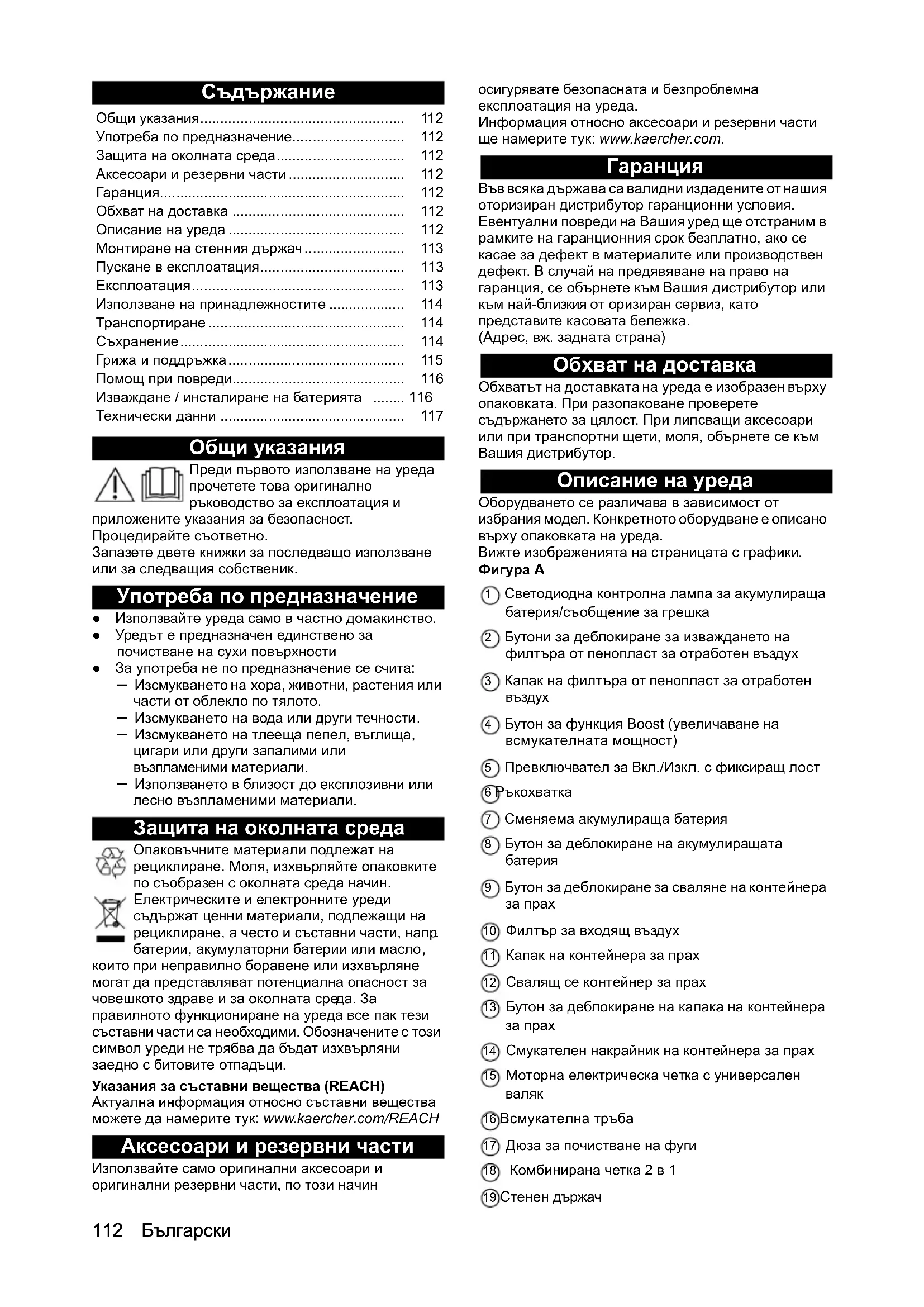 правилното функциониране на уреда все пак тези съставни части са необходими. Обозначените с този символ уреди не трябва да бъдат изхвърляни заедно с битовите отпадъци. Указания за съставни вещества (REACH) Актуална информация относно съставни вещества можете да намерите тук: www.kaercher.com/REACH Аксесоари и резервни части Използвайте само оригинални аксесоари и оригинални резервни части, по този начин осигурявате безопасната и безпроблемна експлоатация на уреда. Информация относно аксесоари и резервни части ще намерите тук: www.kaercher.com.