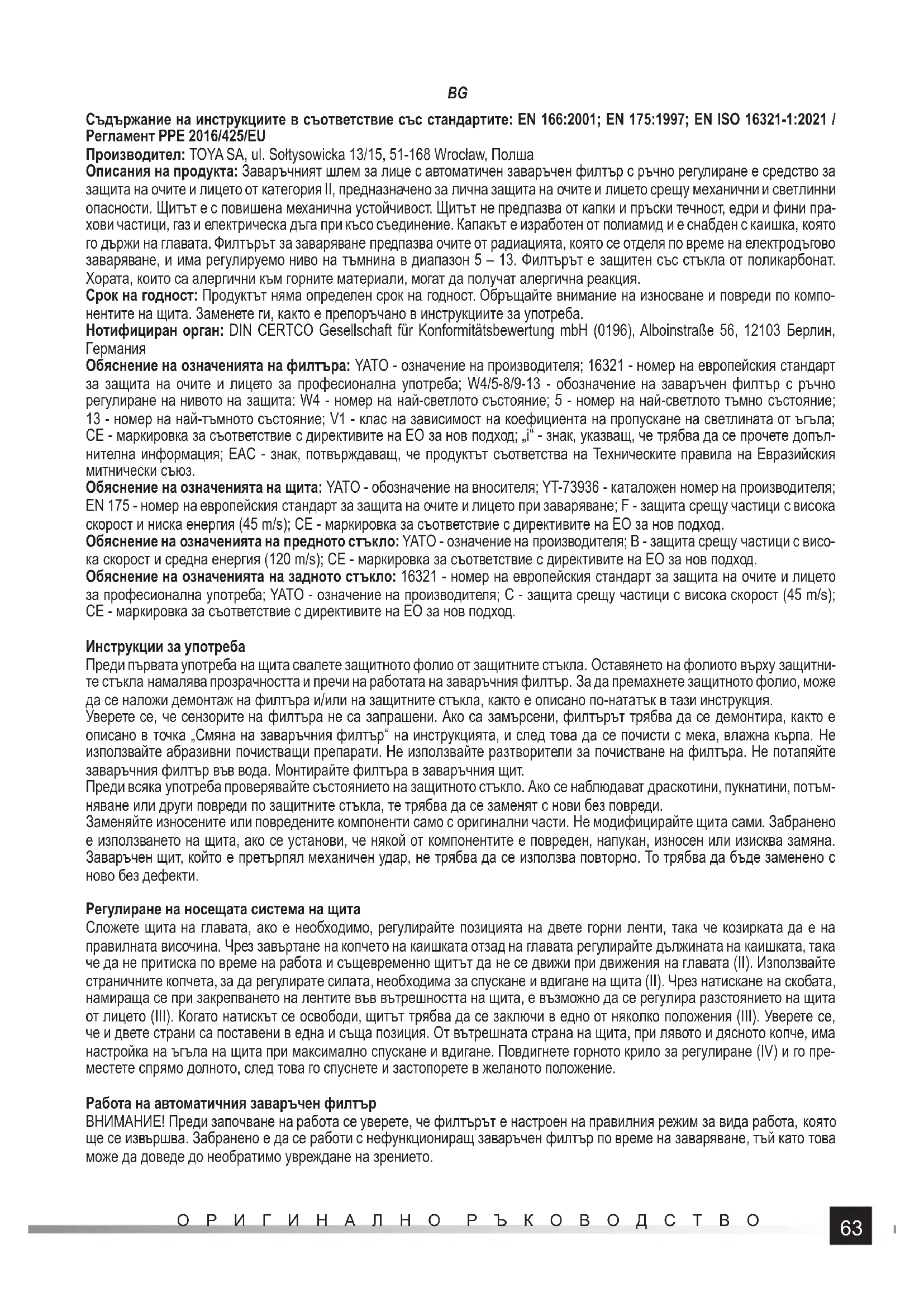 ОРИГИНАЛНО РЪКОВОДСТВО Съдържание на инструкциите в съответствие със стандартите: EN 166:2001; EN 175:1997; EN ISO 16321-1:2021 / Регламент PPE 2016/425/EU Производител: TOYA SA, ul. Sołtysowicka 13/15, 51-168 Wrocław, Полша Описания на продукта: Заваръчният шлем за лице с автоматичен заваръчен филтър с ръчно регулиране е средство за защита на очите и лицето от категория II, предназначено за лична защита на очите и лицето срещу механични и светлинни опасности. Щитът е с повишена механична устойчивост. Щитът не предпазва от капки и пръски течност, едри и фини пра- хови частици, газ и електрическа дъга при късо съединение. Капакът е изработен от полиамид и е снабден с каишка, която го държи на главата. Филтърът за заваряване предпазва очите от радиацията, която се отделя по време на електродъгово заваряване, и има регулируемо ниво на тъмнина в диапазон 5 – 13. Филтърът е защитен със стъкла от поликарбонат. Хората, които са алергични към горните материали, могат да получат алергична реакция. Срок на годност: Продуктът няма определен срок на годност. Обръщайте внимание на износване и повреди по компо- нентите на щита. Заменете ги, както е препоръчано в инструкциите за употреба. Нотифициран орган: DIN CERTCO Gesellschaft für Konformitätsbewertung mbH (0196), Alboinstraße 56, 12103 Берлин,