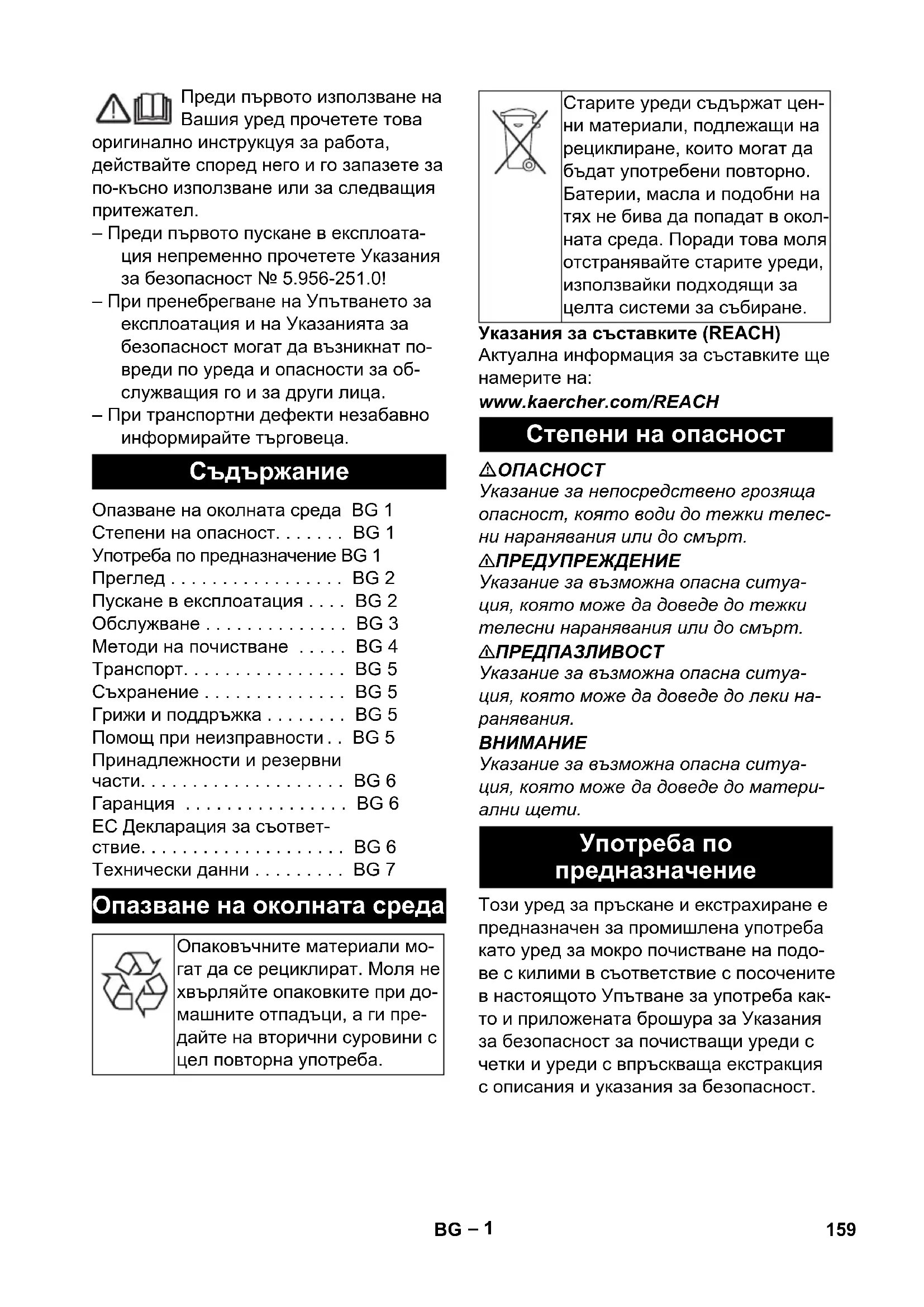 Опазване на околната среда BG 1 Степени на опасност. . . . . . . BG 1 Употреба по предназначение BG 1 Преглед . . . . . . . . . . . . . . . . . BG 2 Пускане в експлоатация . . . . BG 2 Обслужване . . . . . . . . . . . . . . BG 3 Методи на почистване . . . . . BG 4 Tранспoрт. . . . . . . . . . . . . . . . BG 5 Съхранение . . . . . . . . . . . . . . BG 5 Грижи и поддръжка . . . . . . . . BG 5 Помощ при неизправности . . BG 5 Принадлежности и резервни части. . . . . . . . . . . . . . . . . . . . BG 6 Гаранция . . . . . . . . . . . . . . . . BG 6 EC Декларация за съответ- ствие. . . . . . . . . . . . . . . . . . . . BG 6 Технически данни . . . . . . . . . BG 7 Опазване на околната среда Опаковъчните материали мо- гат да се рециклират. Моля не хвърляйте опаковките при до- машните отпадъци, а ги пре- дайте на вторични суровини с цел повторна употреба. Старите уреди съдържат цен- ни материали, подлежащи на рециклиране, които могат да бъдат употребени повторно. Батерии, масла и подобни на тях не бива да попадат в окол- ната среда. Поради това моля отстранявайте старите уреди, използвайки подходящи за целта системи за събиране. Степени на опасност Употреба по предназначение 159BG– 2