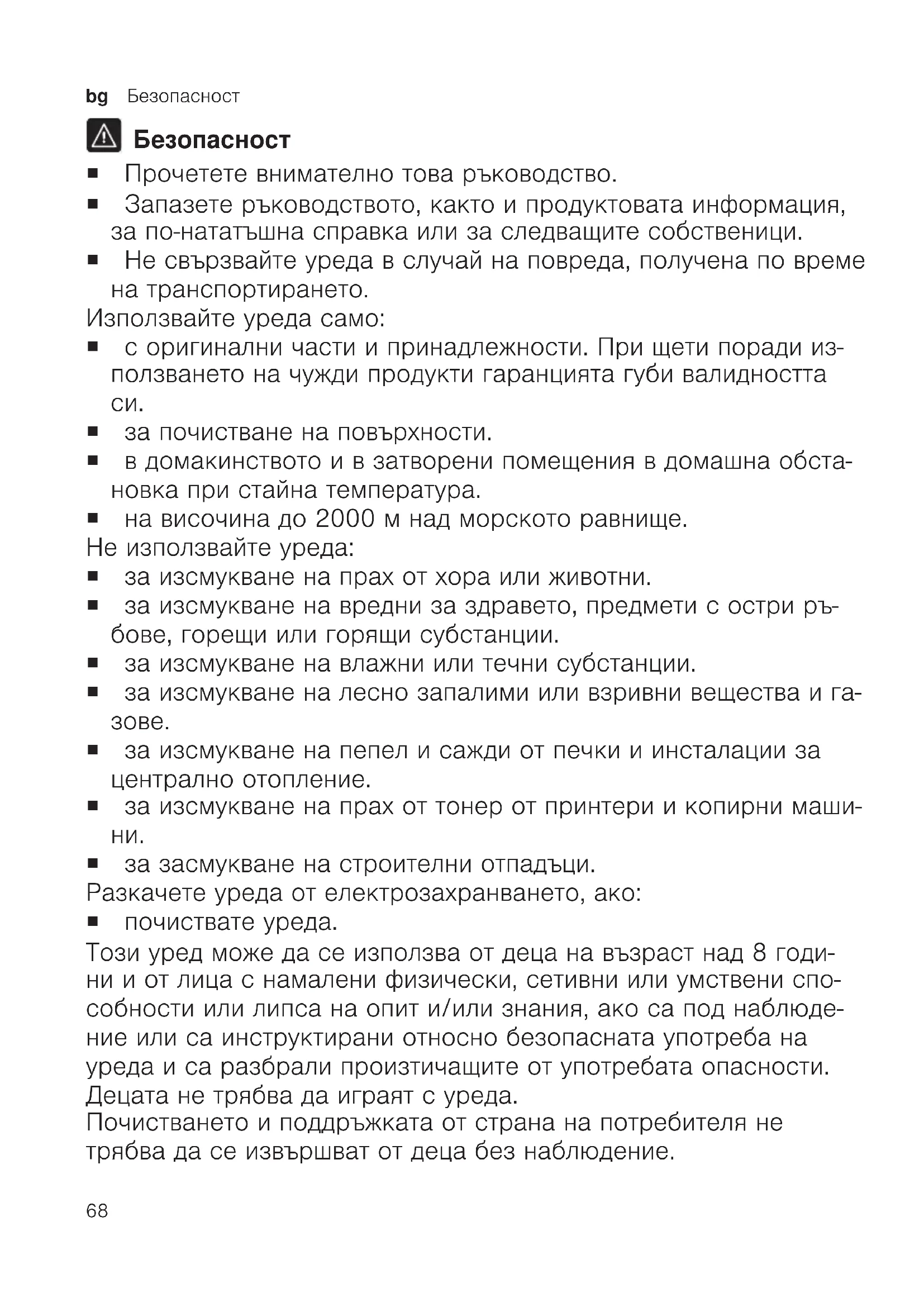 ¡ за засмукване на строителни отпадъци. Разкачете уреда от електрозахранването, ако: ¡ почиствате уреда. Този уред може да се използва от деца на възраст над 8 годи- ни и от лица с намалени физически, сетивни или умствени спо- собности или липса на опит и/или знания, ако са под наблюде- ние или са инструктирани относно безопасната употреба на уреда и са разбрали произтичащите от употребата опасности. Децата не трябва да играят с уреда. Почистването и поддръжката от страна на потребителя не трябва да се извършват от деца без наблюдение.Безопасност bg