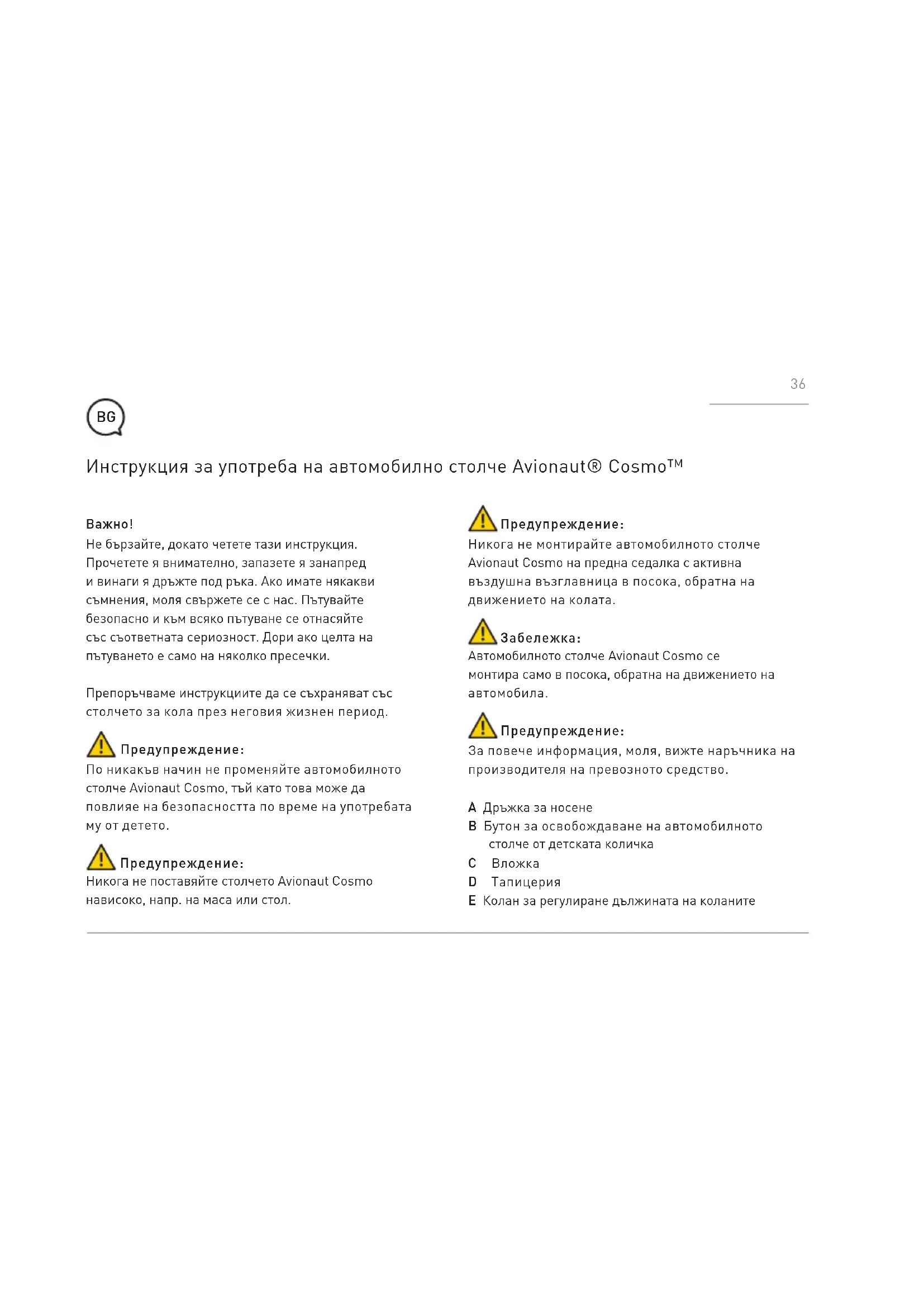 Автомобилното столче Avionaut Cosmo се монтира само в посока, обратна на движението на автомобила. Предупреждение: За повече информация, моля, вижте наръчника на производителя на превозното средство. A Дръжка за носене B Бутон за освобождаване на автомобилното столче от детската количка C Вложка D Тапицерия E Колан за регулиране дължината на коланите