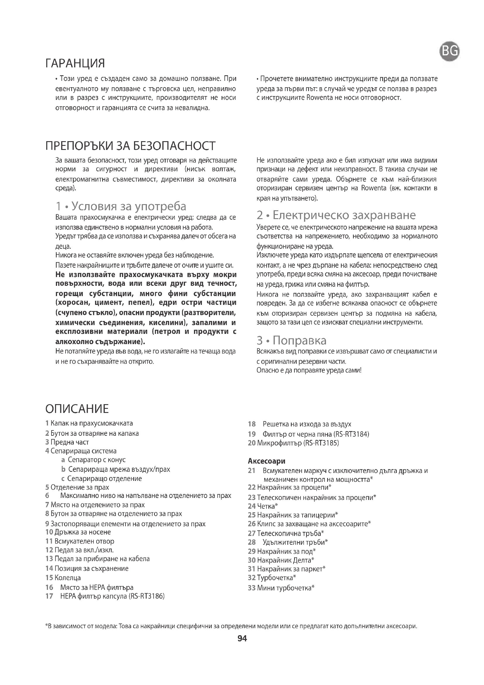 - Прочетете внимателно инструкциите преди да ползвате уреда за първи път: в случай че уредът се ползва в разрез с инструкциите Rowenta не носи отговорност.95 *В зависимост от модела: Това са накрайници специфични за определени модели или се предлагат като допълнителни аксесоари.