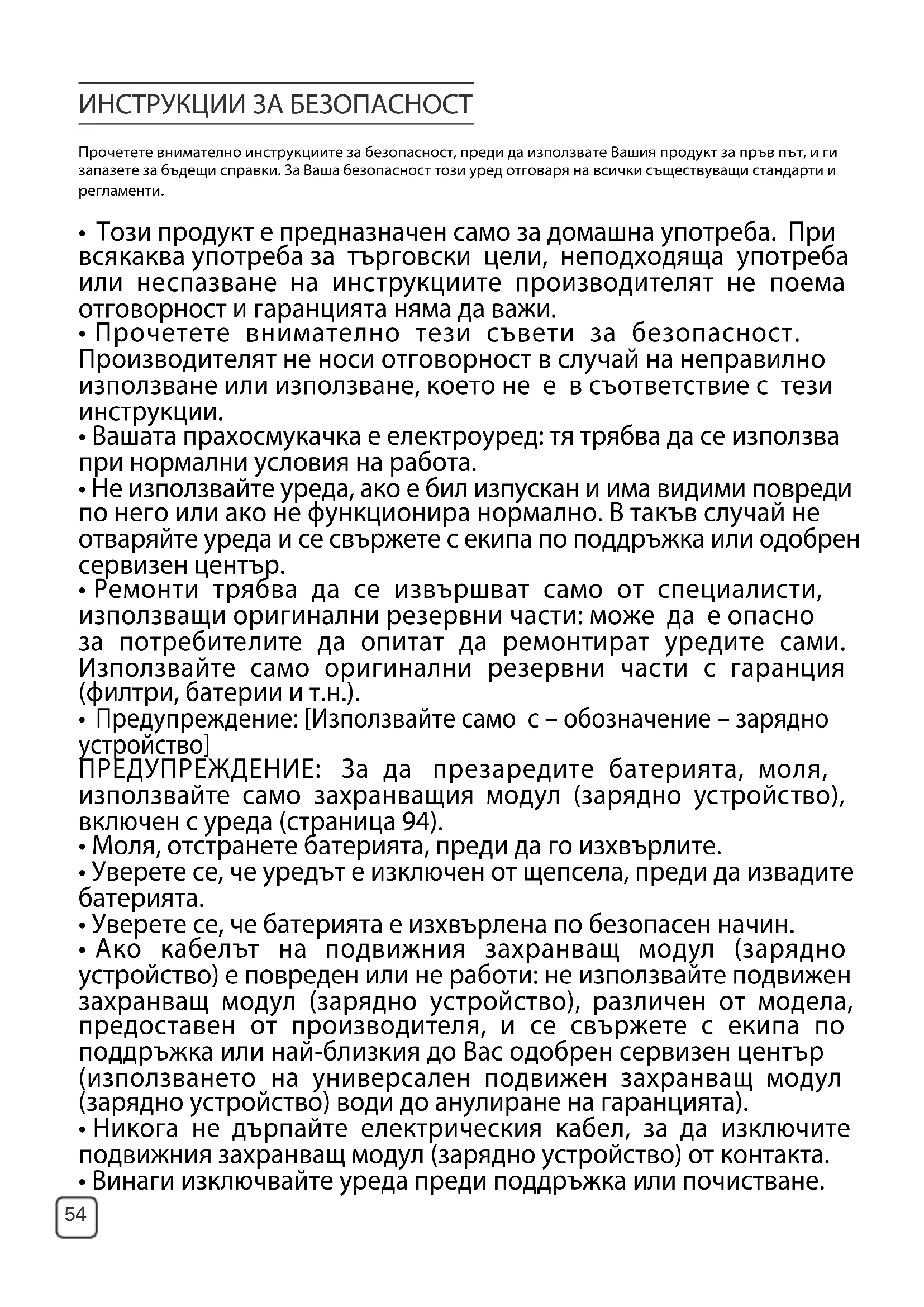 - Не мийте компонентите на контейнера за прах или филтъра за защита на мотора в съдомиялна машина. ИНСТРУКЦИИ ЗА БЕЗОПАСНОСТ НА БАТЕРИЯТА