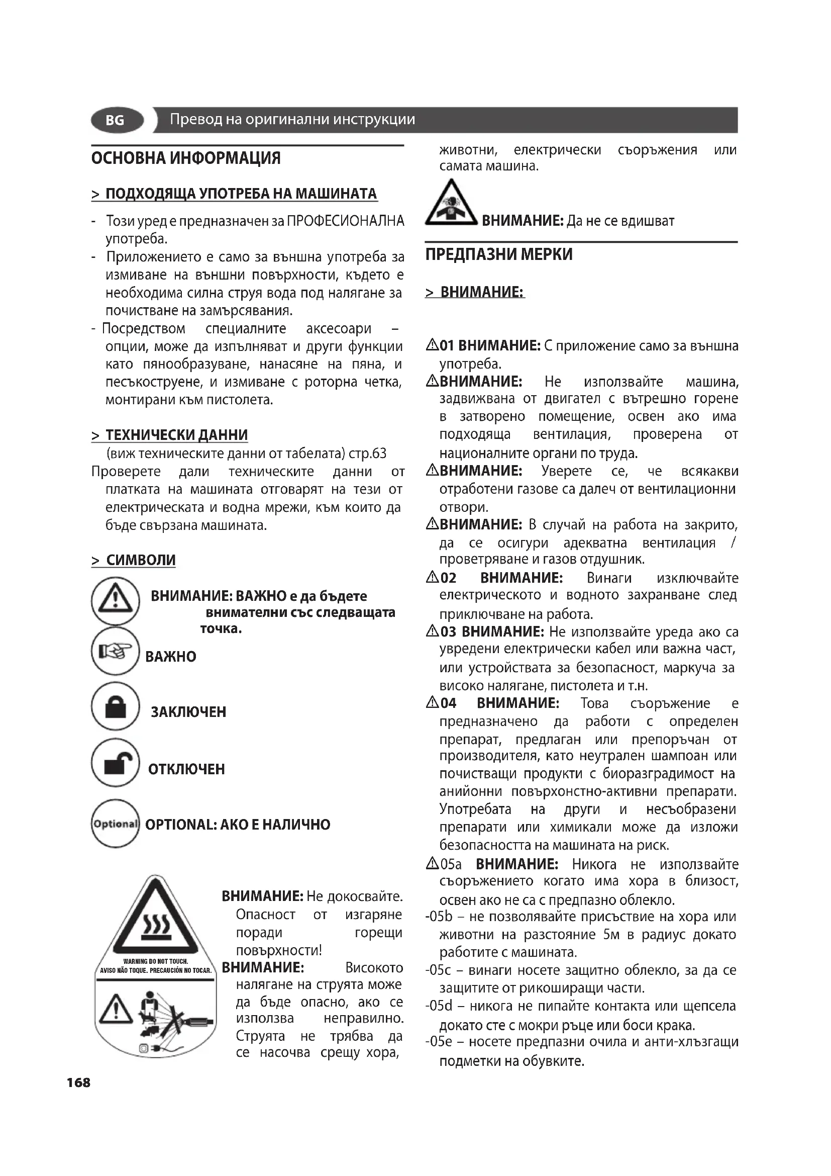 - 04 ВНИМАНИЕ: Това съоръжение е предназначено да работи с определен препарат, предлаган или препоръчан от производителя, като неутрален шампоан или почистващи продукти с биоразградимост на анийонни повърхонстно-активни препарати. Употребата на други и несъобразени препарати или химикали може да изложи безопасността на машината на риск.