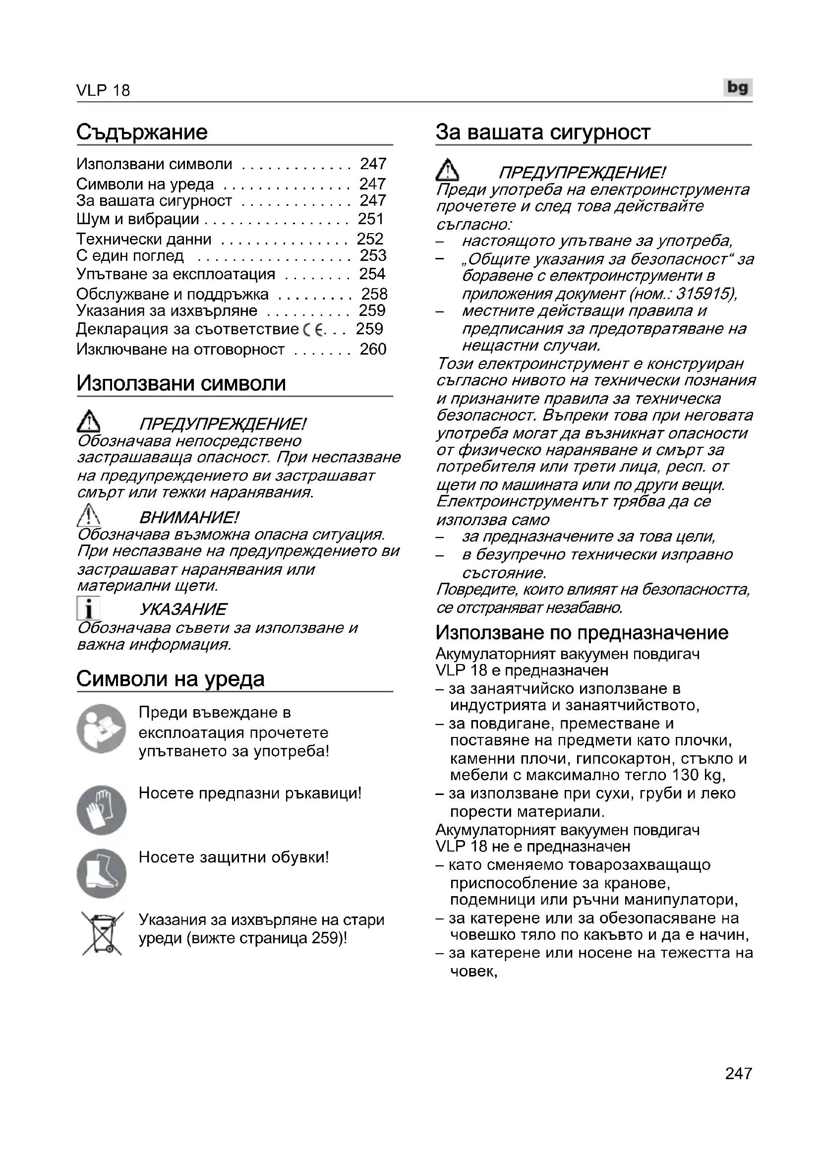 Повредите, които влияят на безопасността, се отстраняват незабавно. Използване по предназначение Акумулаторният вакуумен повдигач VLP 18 е предназначен – за занаятчийско използване в индустрията и занаятчийството, – за повдигане, преместване и поставяне на предмети като плочки, каменни плочи, гипсокартон, стъкло и мебели с максимално тегло 130 kg, – за използване при сухи, груби и леко порести материали. Акумулаторният вакуумен повдигач VLP 18 не е предназначен – като сменяемо товарозахващащо приспособление за кранове, подемници или ръчни манипулатори, – за катерене или за обезопасяване на човешко тяло по какъвто и да е начин, – за катерене или носене на тежестта на човек,VLP 18