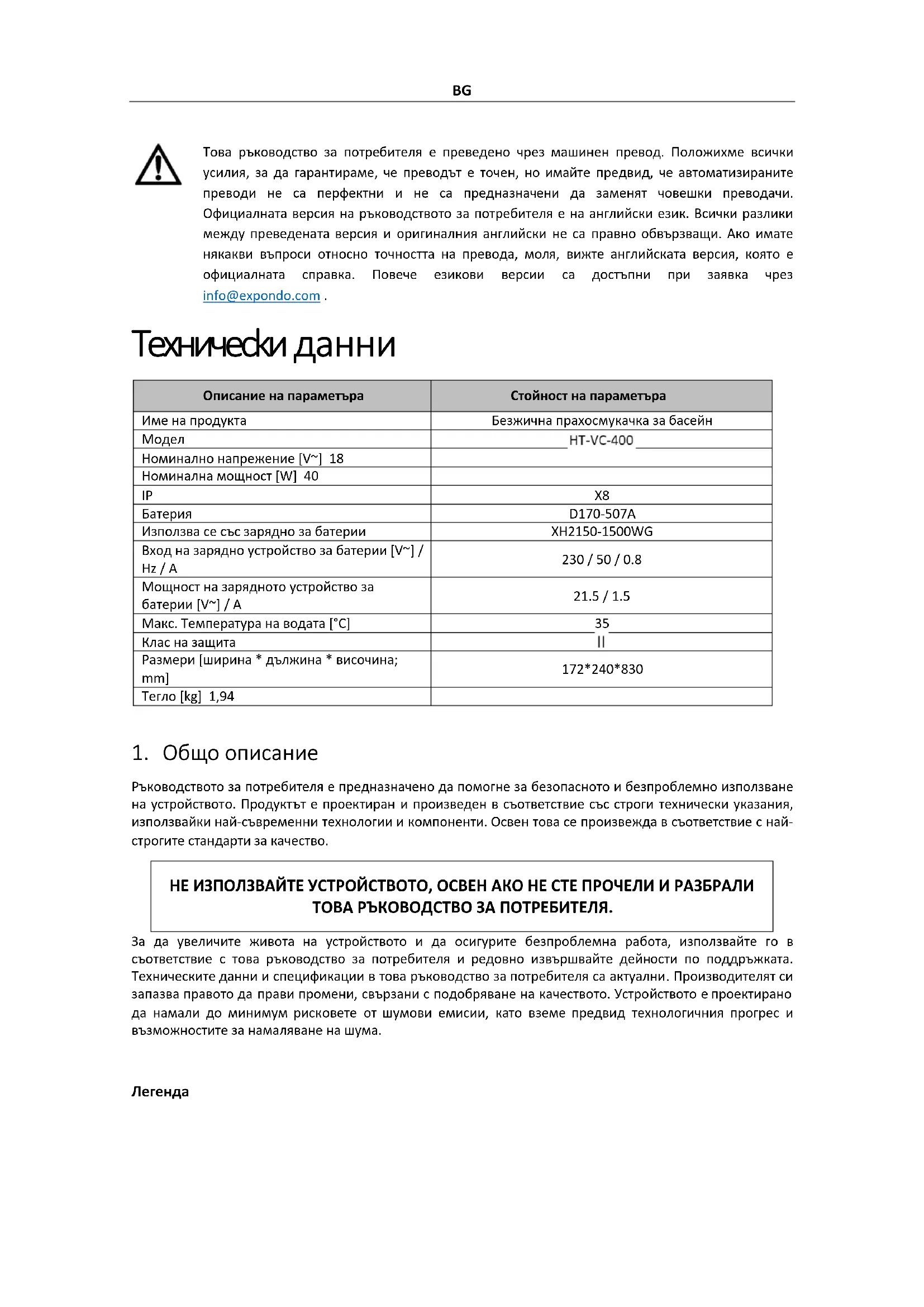 Ръководството за потребителя е предназначено да помогне за безопасното и безпроблемно използване на устройството. Продуктът е проектиран и произведен в съответствие със строги технически указания, използвайки най-съвременни технологии и компоненти. Освен това се произвежда в съответствие с най- строгите стандарти за качество. НЕ ИЗПОЛЗВАЙТЕ УСТРОЙСТВОТО, ОСВЕН АКО НЕ СТЕ ПРОЧЕЛИ И РАЗБРАЛИ ТОВА РЪКОВОДСТВО ЗА ПОТРЕБИТЕЛЯ. За да увеличите живота на устройството и да осигурите безпроблемна работа, използвайте го в съответствие с това ръководство за потребителя и редовно извършвайте дейности по поддръжката. Техническите данни и спецификации в това ръководство за потребителя са актуални. Производителят си запазва правото да прави промени, свързани с подобряване на качеството. Устройството е проектирано да намали до минимум рисковете от шумови емисии, като вземе предвид технологичния прогрес и възможностите за намаляване на шума. ЛегендаBG Продуктът отговаря на съответните стандарти за безопасност. Прочетете инструкциите преди употреба. Продуктът трябва да бъде рециклиран. ПРЕДУПРЕЖДЕНИЕ! или ВНИМАНИЕ! или ЗАПОМНЕТЕ! Приложимо към дадената ситуация. (общ предупредителен знак) ВНИМАНИЕ! Предупреждение за токов удар! ВНИМАНИЕ! Прочетете всички предупреждения за безопасност и всички инструкции. Неспазването на предупрежденията и инструкциите може да доведе до токов удар, пожар и/или сериозно нараняване или дори смърт. Термините "устройство" или "продукт" се използват в предупрежденията и инструкциите за позоваване