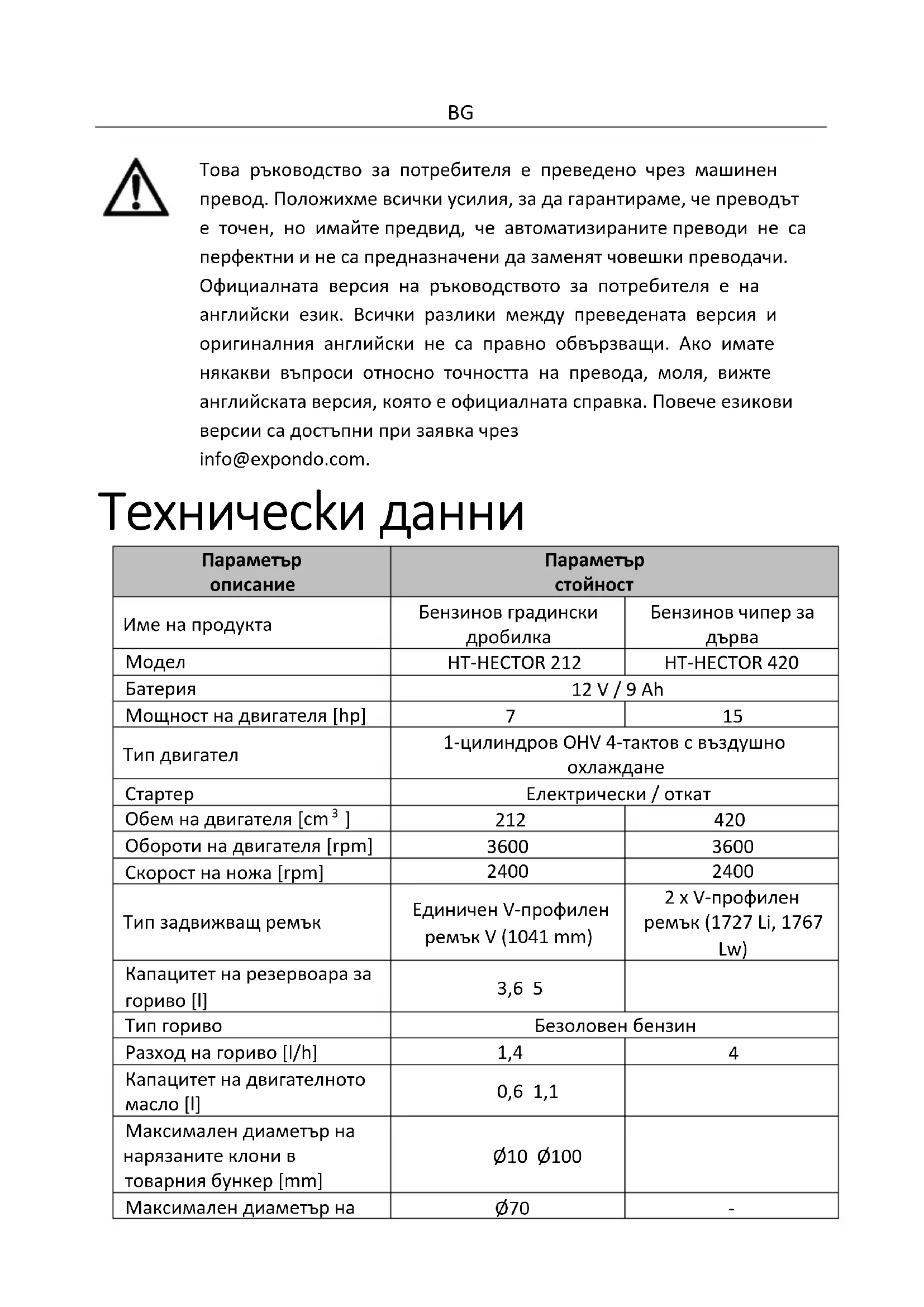 на употреба поради прекомерно натоварване. Това може да доведе до прегряване на задвижващите елементи и повреда на устройството. j) Не докосвайте шарнирни части или аксесоари, освен ако устройството не е изключено от източника на захранване. k) Не накланяйте и не транспортирайте машината, когато работи. l) Не оставяйте машината без надзор, докато работи. Изключвайте машината и изключвайте кабела на свещта винаги, когато напускате работната зона. m) Почиствайте устройството редовно, за да предотвратите натрупването на упорита мръсотия. n) Устройството не е играчка. Почистването и поддръжката не могат да се извършват от деца без надзор от възрастен. Забранява се намеса в структурата на уреда с цел промяна на неговите параметри или конструкция. o) Не монтирайте, отстранявайте, настройвайте или обслужвайте изпускателната решетка на други части, докато двигателят работи. p) Когато двигателят работи, дръжте всички части на тялото и тежки предмети далеч от товарния бункер (основен и допълнителен за HT- HECTOR 212) и изходния улей. q) Не поставяйте крайниците в зареждащия бункер и изхода за чипове, докато машината работи. Това може да доведе до издърпване и/или порязване на крайниците. r) Не подавайте в машината метал, камъни, бутилки, кутии върху други неботанически предмети. s) Въртящите се режещи остриета вътре в тези отвори ще причинят сериозно нараняване, ако бъдат докоснати. t) Бъдете внимателни, докато работите. Машината може да изхвърля фрагменти от обработения материал от товарния бункер или изходния улей.BG u) Двигателят се нагрява много по време на работа. Не докосвайте горещия двигател, защото може да причини изгаряния.