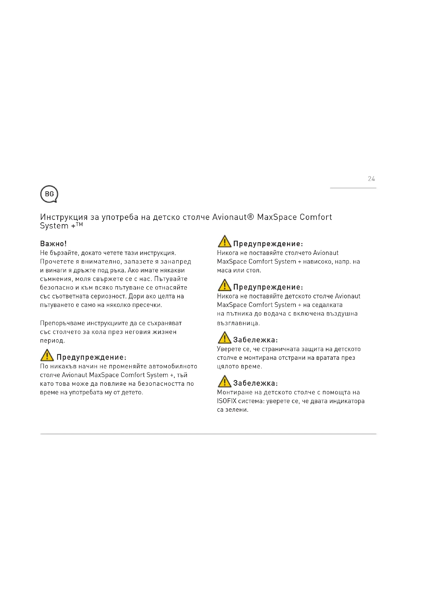 Предупреждение: По никакъв начин не променяйте автомобилното столче Avionaut MaxSpace Comfort System +, тъй като това може да повлияе на безопасността по време на употребата му от детето. Инструкция за употреба на детско столче Avionaut® MaxSpace Comfort System +™ Предупреждение: Никога не поставяйте столчето Avionaut MaxSpace Comfort System + нависоко, напр. на маса или стол. Предупреждение: Никога не поставяйте детското столче Avionaut MaxSpace Comfort System + на седалката на пътника до водача с включена въздушна възглавница.