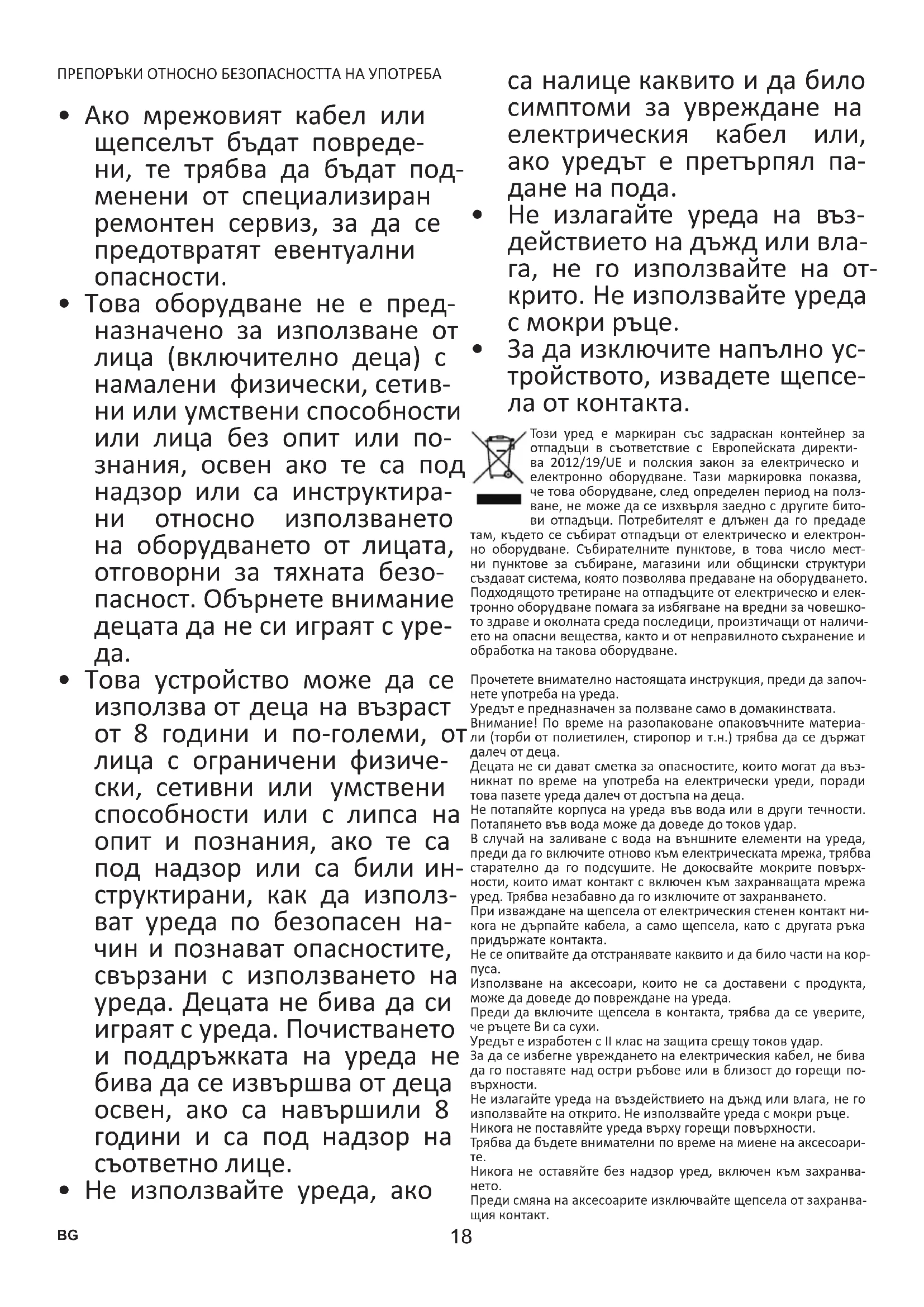 - За да изключите напълно ус- тройството, извадете щепсе- ла от контакта. Този уред е маркиран със задраскан контейнер за отпадъци в съответствие с Европейската директи- ва 2012/19/UE и полския закон за електрическо и електронно оборудване. Тази маркировка показва, че това оборудване, след определен период на полз- ване, не може да се изхвърля заедно с другите бито- ви отпадъци. Потребителят е длъжен да го предаде там, където се събират отпадъци от електрическо и електрон- но оборудване. Събирателните пунктове, в това число мест- ни пунктове за събиране, магазини или общински структури създават система, която позволява предаване на оборудването. Подходящото третиране на отпадъците от електрическо и елек- тронно оборудване помага за избягване на вредни за човешко- то здраве и околната среда последици, произтичащи от наличи- ето на опасни вещества, както и от неправилното съхранение и обработка на такова оборудване. Прочетете внимателно настоящата инструкция, преди да започ- нете употреба на уреда. Уредът е предназначен за ползване само в домакинствата. Внимание! По време на разопаковане опаковъчните материа- ли (торби от полиетилен, стиропор и т.н.) трябва да се държат далеч от деца. Децата не си дават сметка за опасностите, които могат да въз- никнат по време на употреба на електрически уреди, поради това пазете уреда далеч от достъпа на деца. Не потапяйте корпуса на уреда във вода или в други течности. Потапянето във вода може да доведе до токов удар. В случай на заливане с вода на външните елементи на уреда, преди да го включите отново към електрическата мрежа, трябва старателно да го подсушите. Не докосвайте мокрите повърх- ности, които имат контакт с включен към захранващата мрежа уред. Трябва незабавно да го изключите от захранването. При изваждане на щепсела от електрическия стенен контакт ни- кога не дърпайте кабела, а само щепсела, като с другата ръка придържате контакта. Не се опитвайте да отстранявате каквито и да било части на кор-