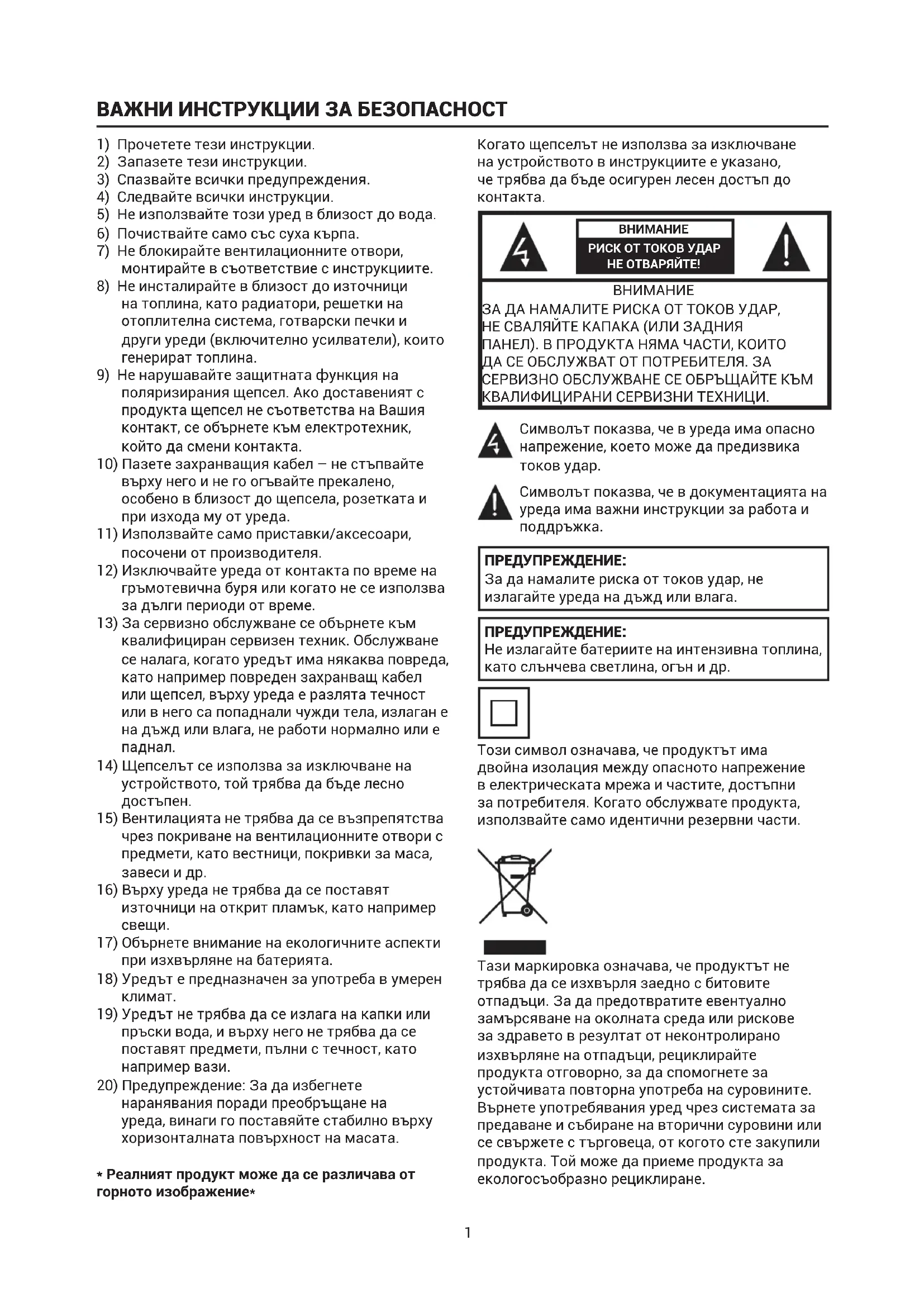 ЗА ДА НАМАЛИТЕ РИСКА ОТ ТОКОВ УДАР, НЕ СВАЛЯЙТЕ КАПАКА (ИЛИ ЗАДНИЯ ПАНЕЛ). В ПРОДУКТА НЯМА ЧАСТИ, КОИТО ДА СЕ ОБСЛУЖВАТ ОТ ПОТРЕБИТЕЛЯ. ЗА СЕРВИЗНО ОБСЛУЖВАНЕ СЕ ОБРЪЩАЙТЕ КЪМ КВАЛИФИЦИРАНИ СЕРВИЗНИ ТЕХНИЦИ. Символът показва, че в уреда има опасно напрежение, което може да предизвика токов удар. Символът показва, че в документацията на уреда има важни инструкции за работа и