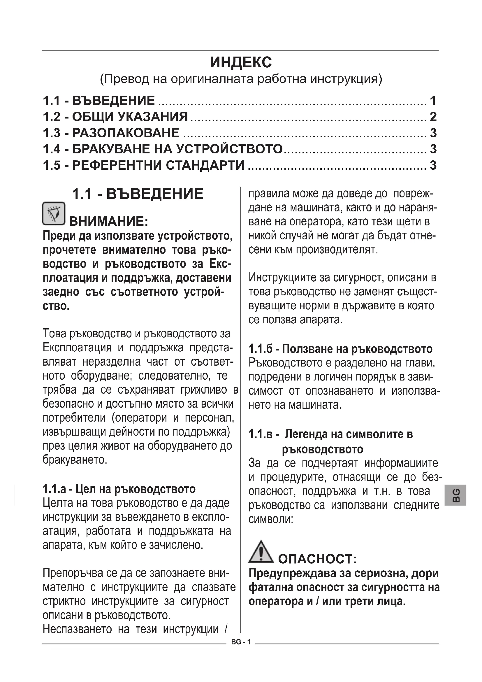 Целта на това ръководство е да даде инструкции за въвеждането в експло- атация, работата и поддръжката на апарата, към който е зачислено. Препоръчва се да се запознаете вни- мателно с инструкциите да спазвате стриктно инструкциите за сигурност описани в ръководството. Неспазването на тези инструкции / правила може да доведе до повреж- дане на машината, както и до нараня- ване на оператора, като тези щети в никой случай не могат да бъдат отне- сени към производителят. Инструкциите за сигурност, описани в това ръководство не заменят същест- вуващите норми в държавите в която се ползва апарата.